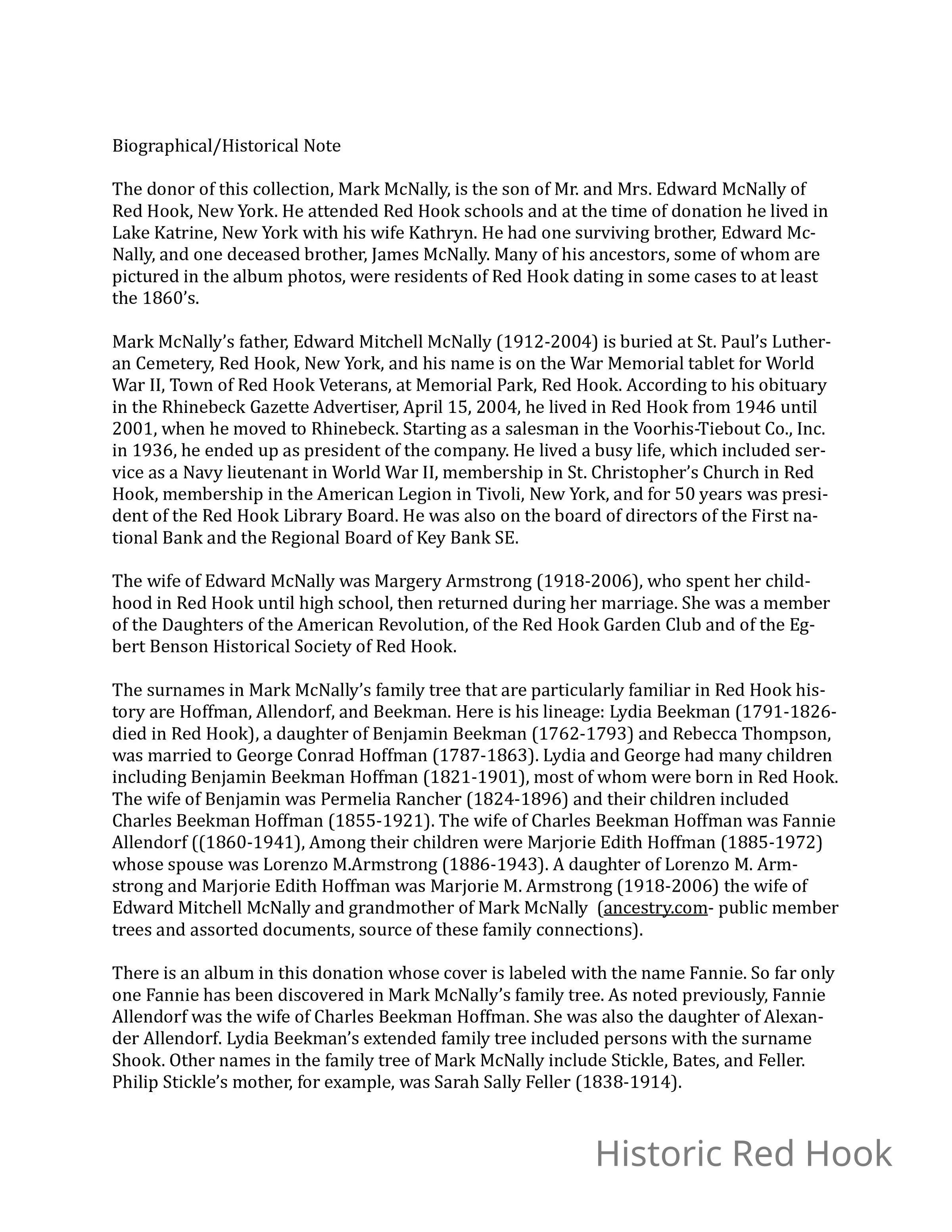 The surnames in Mark McNally’s family tree that are particularly familiar in Red Hook his- tory are Hoffman, Allendorf, and Beekman. Here is his lineage: Lydia Beekman (1791-1826- died in Red Hook), a daughter of Benjamin Beekman (1762-1793) and Rebecca Thompson, was married to George Conrad Hoffman (1787-1863). Lydia and George had many children including Benjamin Beekman Hoffman (1821-1901), most of whom were born in Red Hook. The wife of Benjamin was Permelia Rancher (1824-1896) and their children included Charles Beekman Hoffman (1855-1921). The wife of Charles Beekman Hoffman was Fannie Allendorf ((1860-1941), Among their children were Marjorie Edith Hoffman (1885-1972) whose spouse was Lorenzo M.Armstrong (1886-1943). A daughter of Lorenzo M. Arm- strong and Marjorie Edith Hoffman was Marjorie M. Armstrong (1918-2006) the wife of Edward Mitchell McNally and grandmother of Mark McNally (ancestry.com- public member trees and assorted documents, source of these family connections).