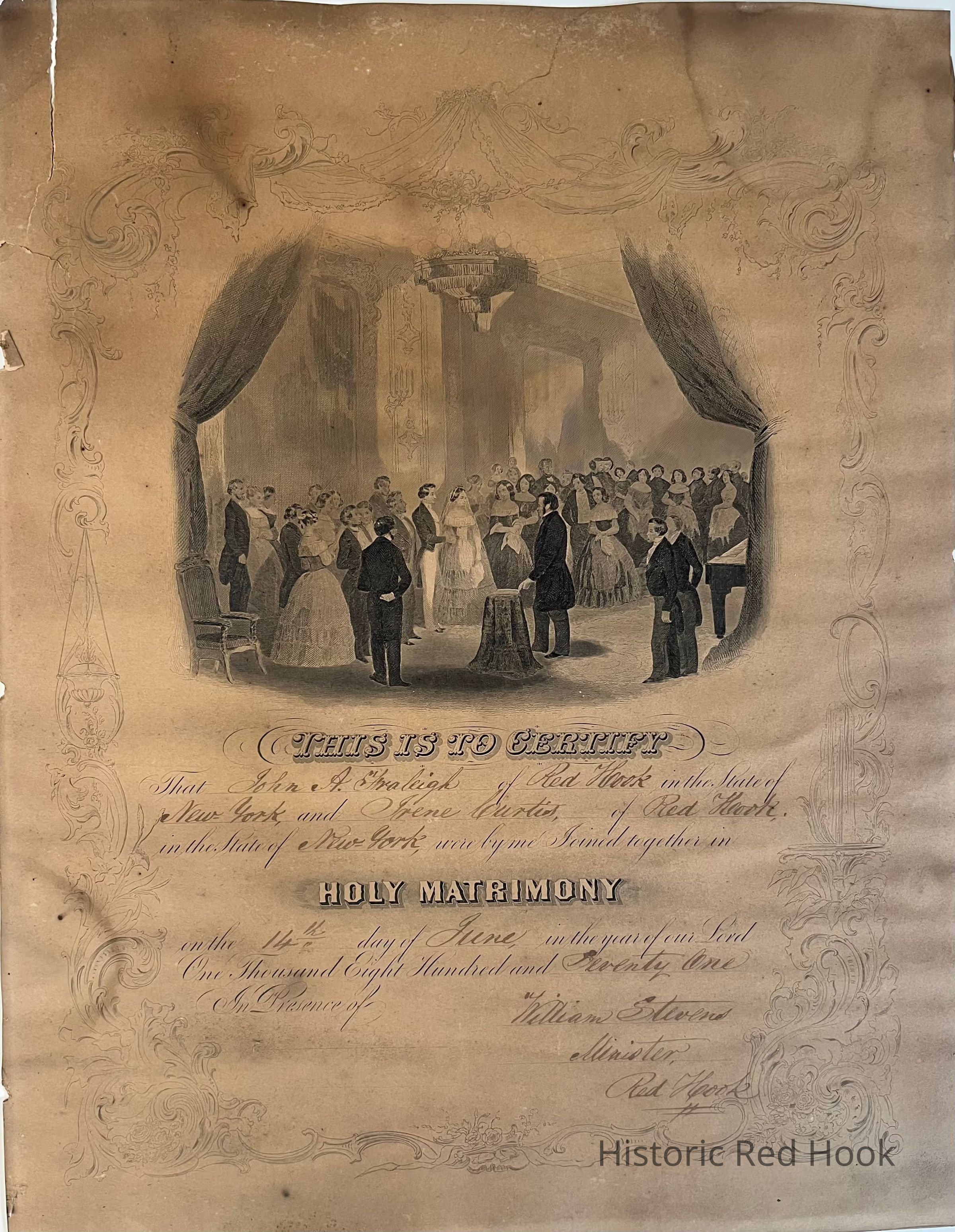 Marriage Certificate, heavy paper, for John A. Fraleigh and Irene Curtis, June 14, 1871, Red Hook, New York, heavily soiled and stained, 15 1/2”, 12”WCollection