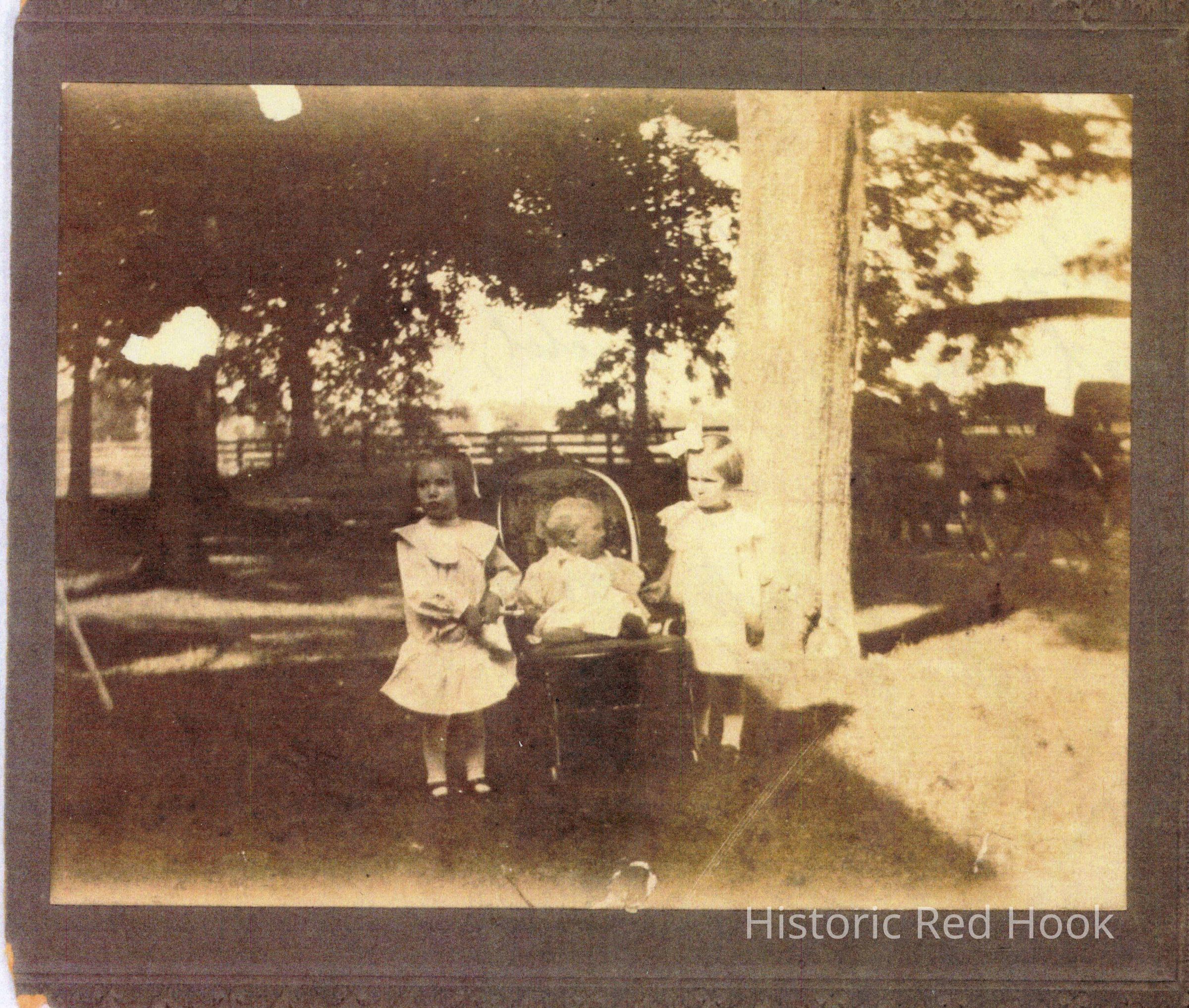 Copy of a photograph showing two young girls and a baby in a carriage identified as Mary Budd Hardin left, Agnes Losee Clark, right, Baby Elizabeth Perrine at the Eugene Budd Farm, Budds Corners; original photo owned by Peter HardinPhotograph Details