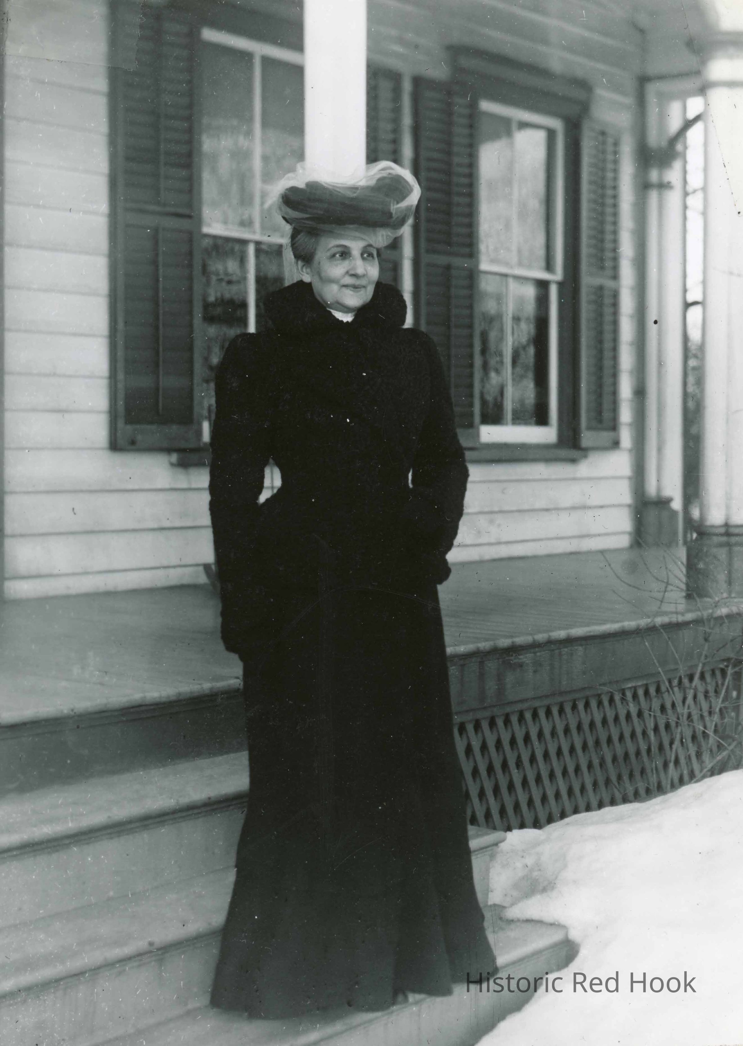 Photo of woman with hat standing in front of a house porch. Label says Mary J. Nicks (wife of Dr. H. L. Cookingham). Back says 'Mrs. Dr. Cookhingham.' Sticky note says "known as Cousin Mamie"Photograph Details