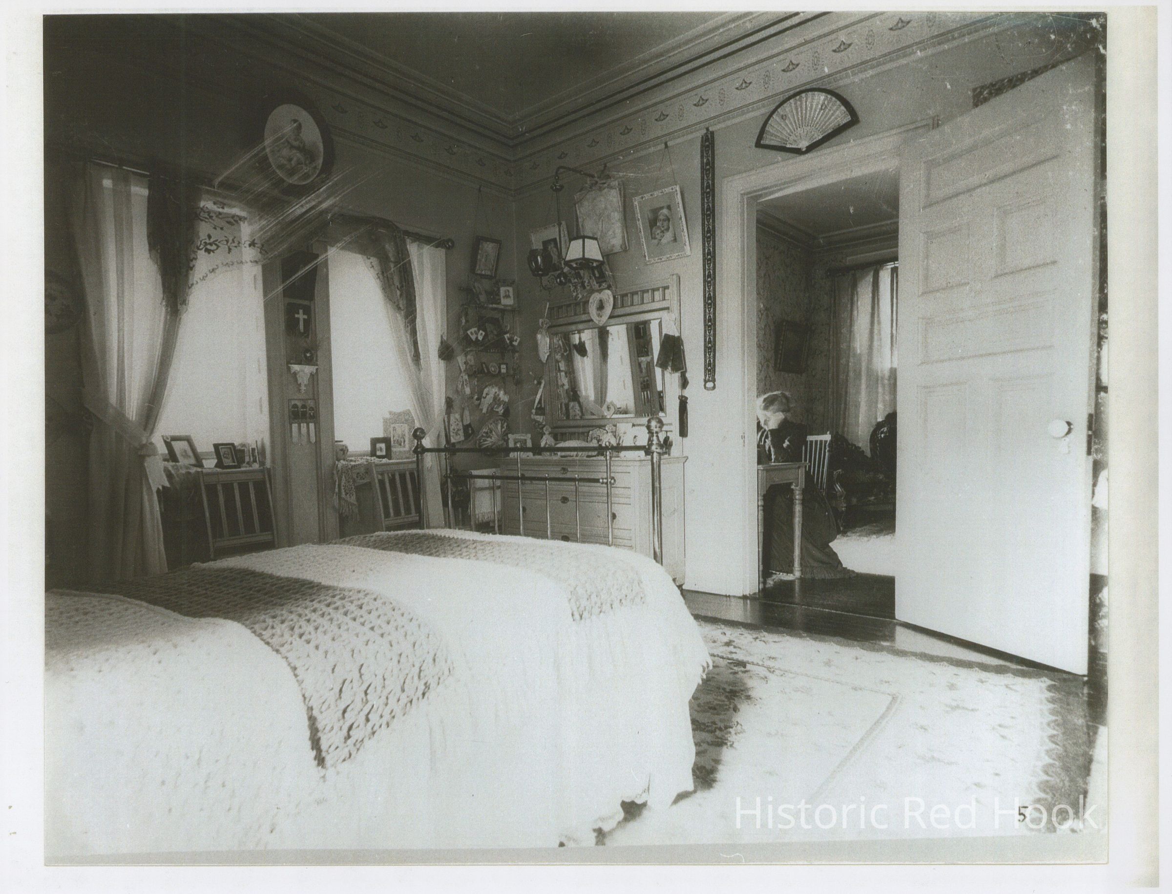 Image of a bedroom at Massena. The door is open showing an adjoining room with a woman seated at a desk.