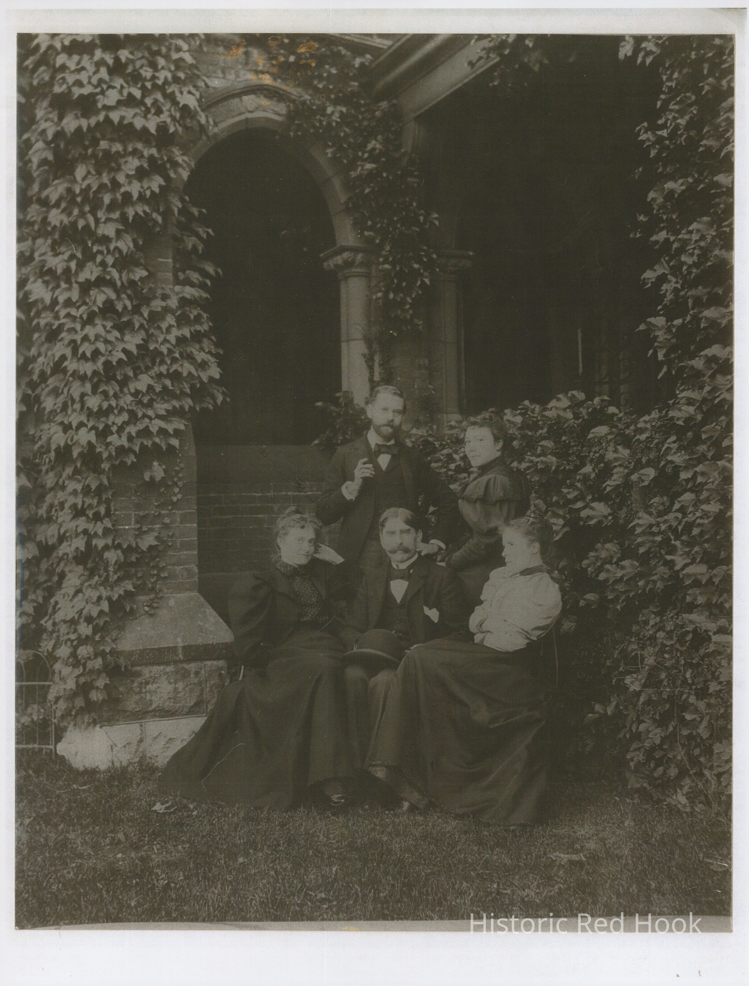 Photographic image of two men and three women seated and standing outdoors near Massena.