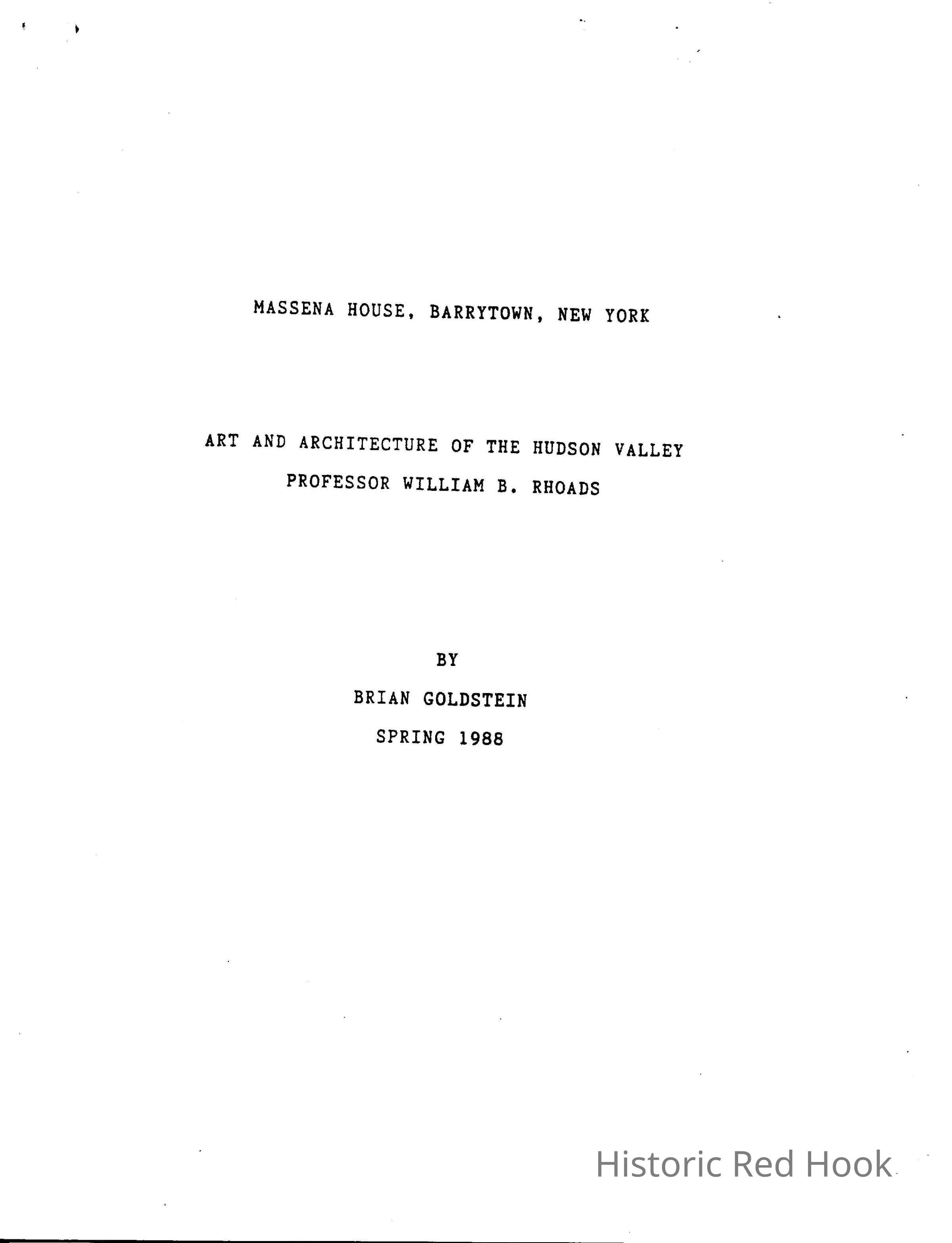 "Massena House, Barrytown, New York, Art and Architecture of the Hudson Valley, for Professor William B. Rhoads by Brian Goldstein, Spring 1988." This Bard student paper contains a brief history of Massena from 1797 to 1988Collection