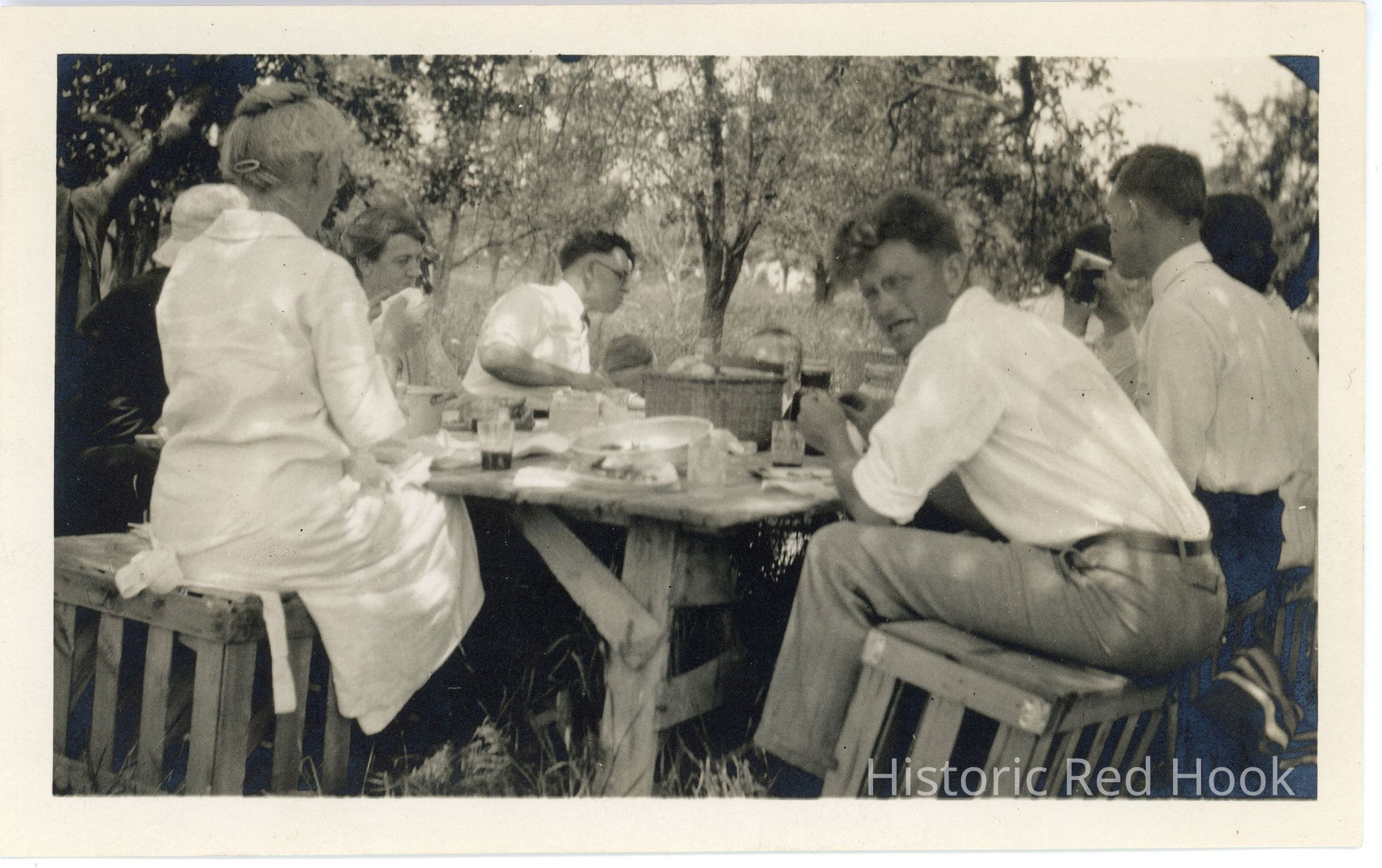 Mead family picnic, July 4, 1924. G. Gordon to the right, Nelson on the left. sitting on fruit crates.Photograph Details
