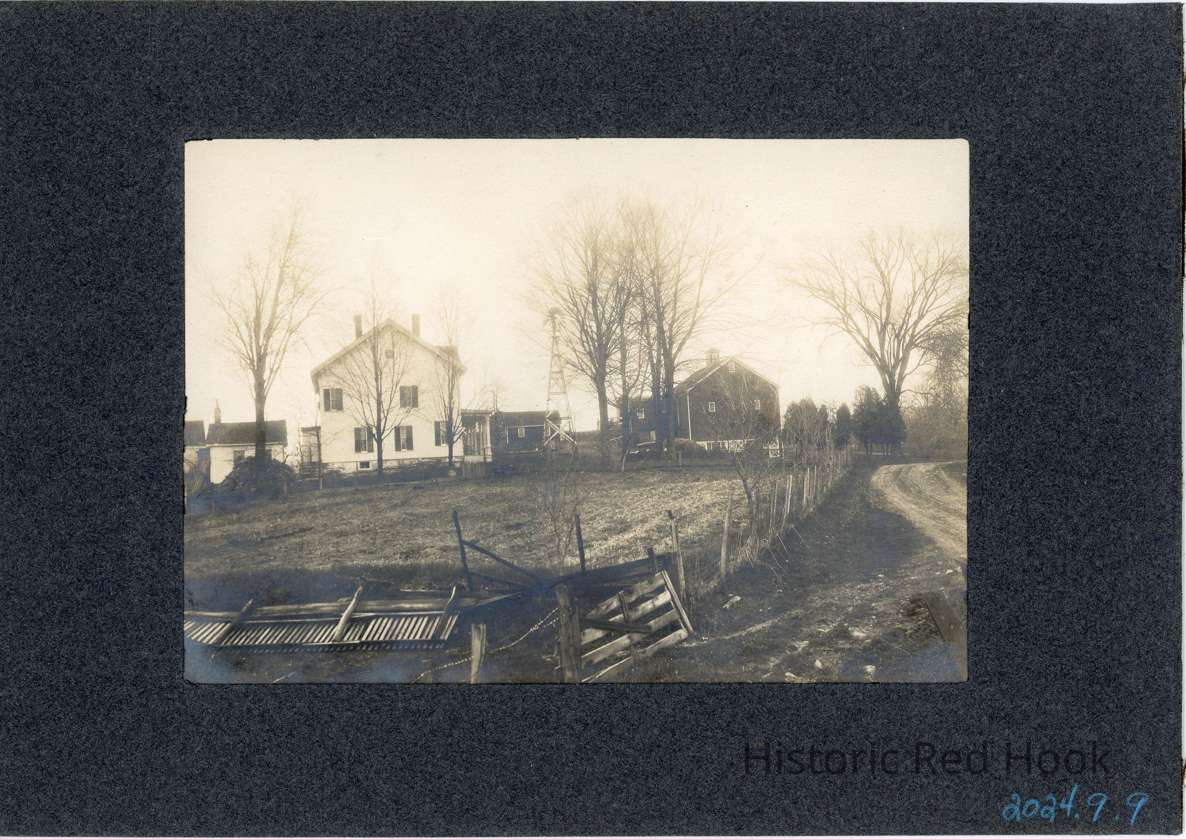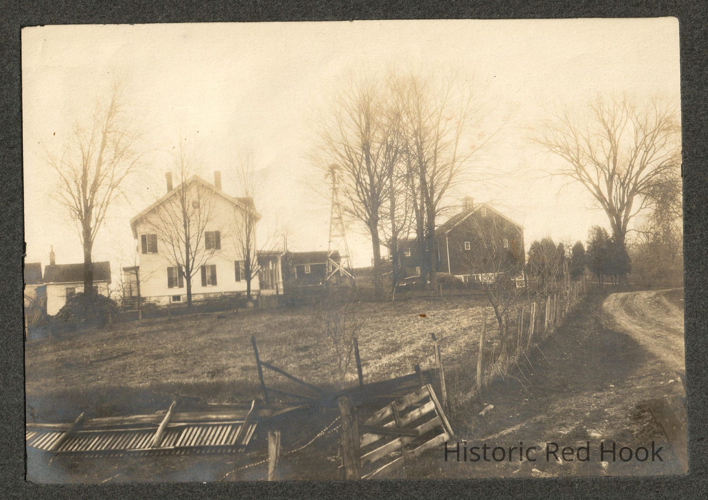 View of Mead farmstead with farmhouse, barn and windmill. Photographed from Mead scrapbook owned by Chuck Mead. c. 1916. Original photo acquired as part of second donation.Photograph Details