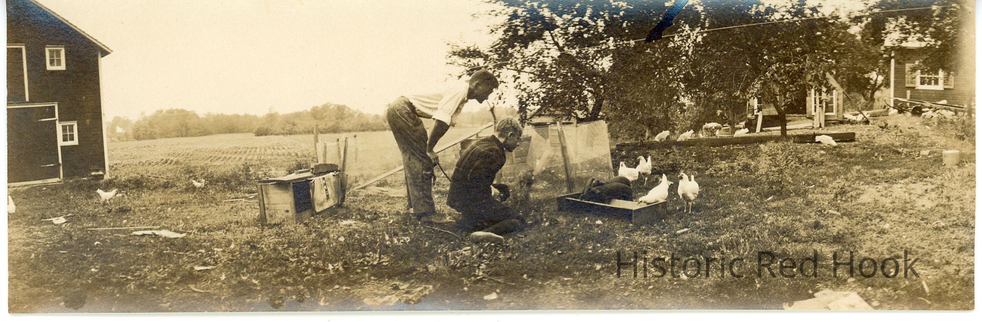 Black and white panorama view of Mead farmstead, man and boy looking at piglets and chickens, between 1916 and 1920.Photograph Details