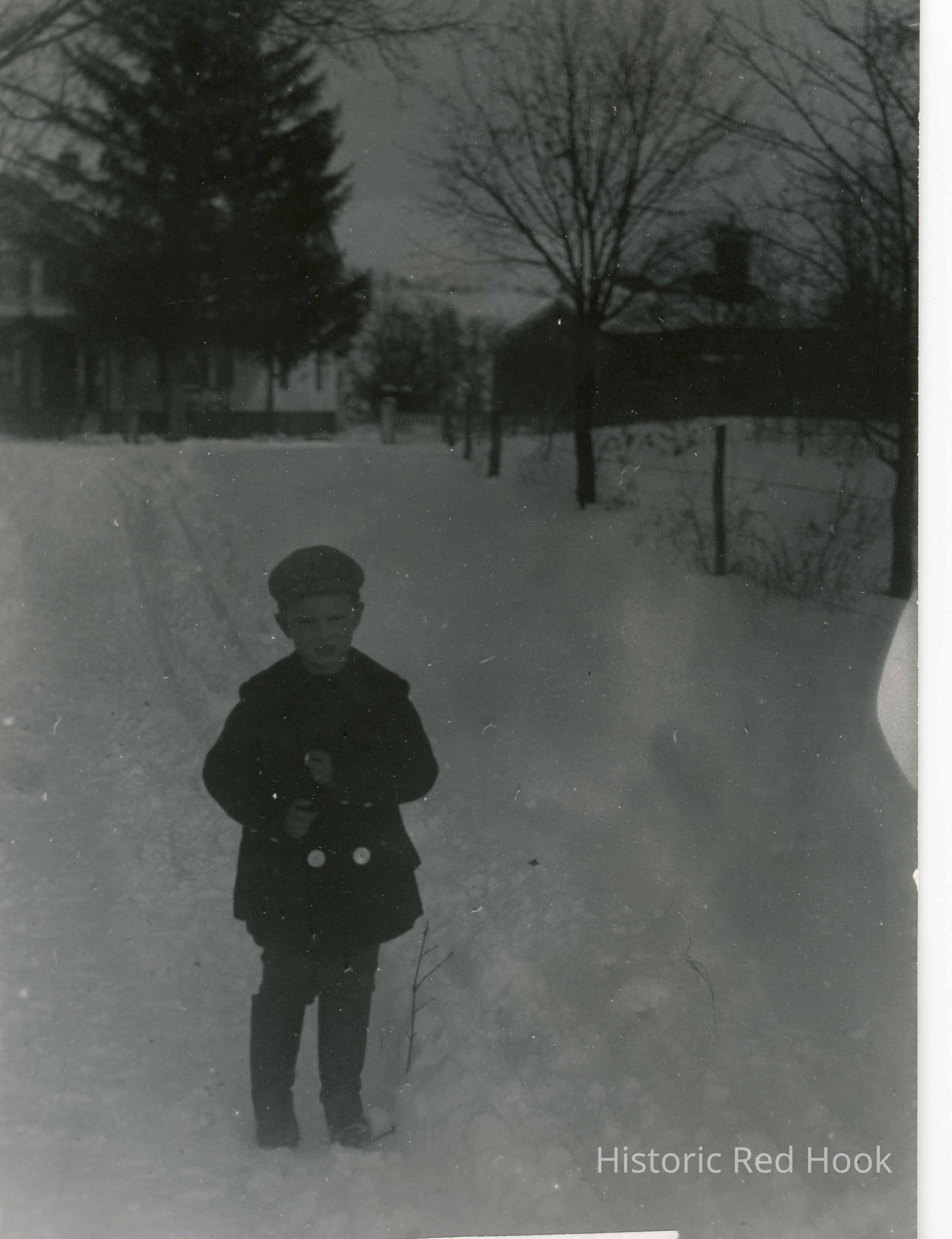 Outdoor WS Teator Glass plate negative #5 Neighbors 2014.008.096 of a young boy on a road in the wintertime identified as Melvin HamPhotograph Details