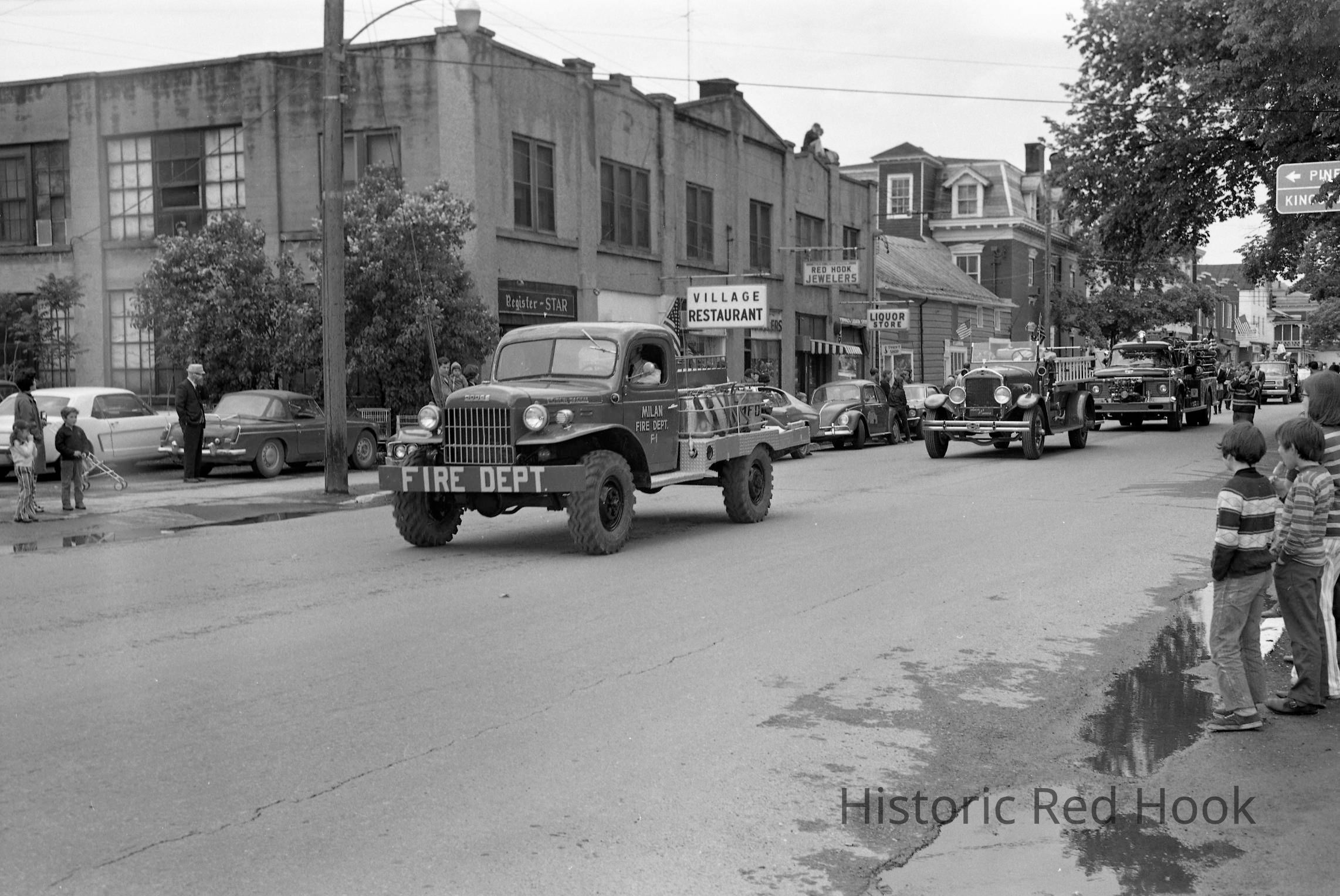Memorial Day parade, North Broadway, 1971. Line of fire trucks. Signs for Register-Star, Village Restaurant, Red Hook Jewelers and Liquor Store visible.Photograph Details