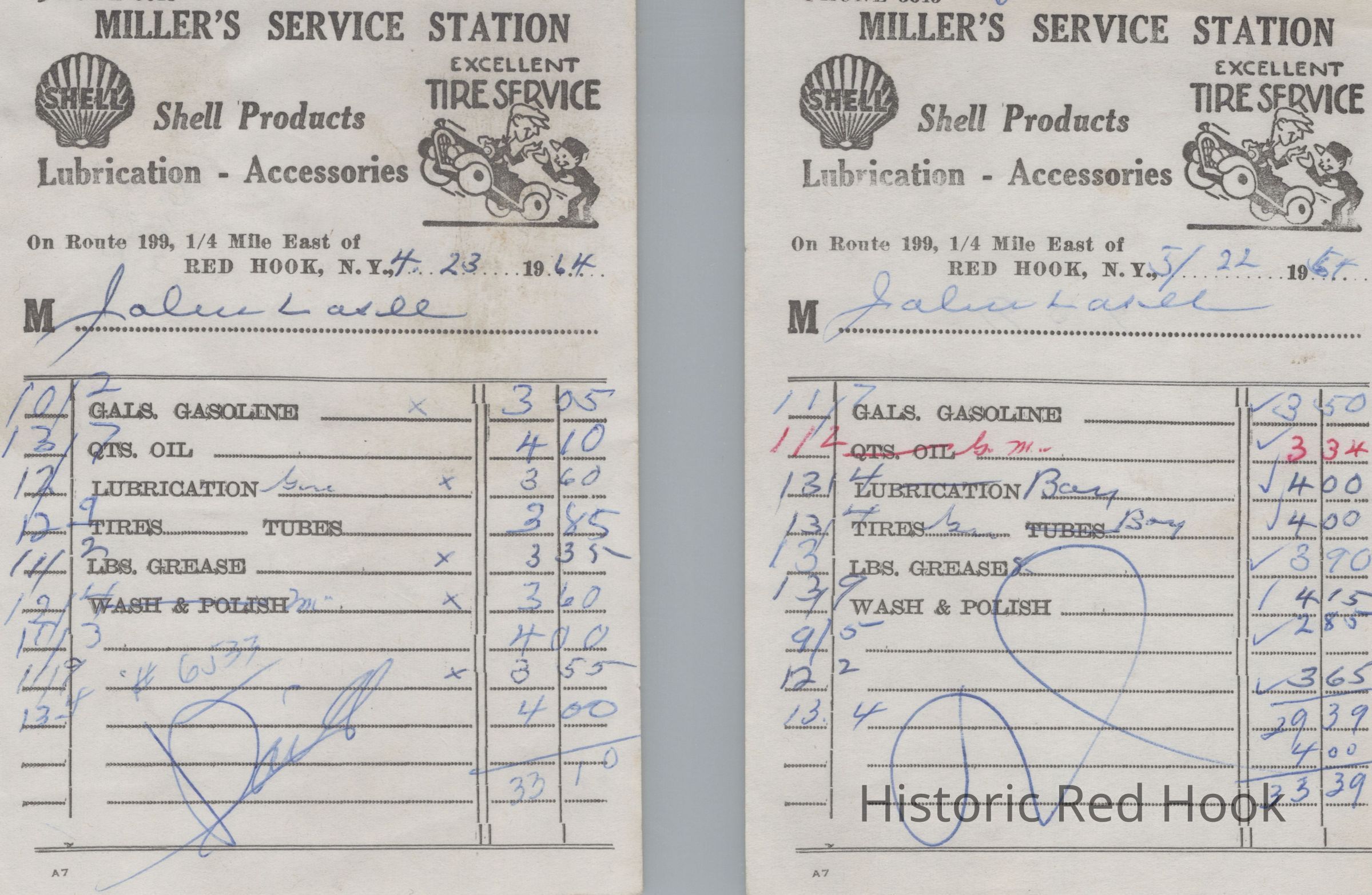 Two receipts from Miller's Service Station, 1/4 mile east of Red Hook on Route 199 to John Losee, April 23 and May 22, 1964Relationships