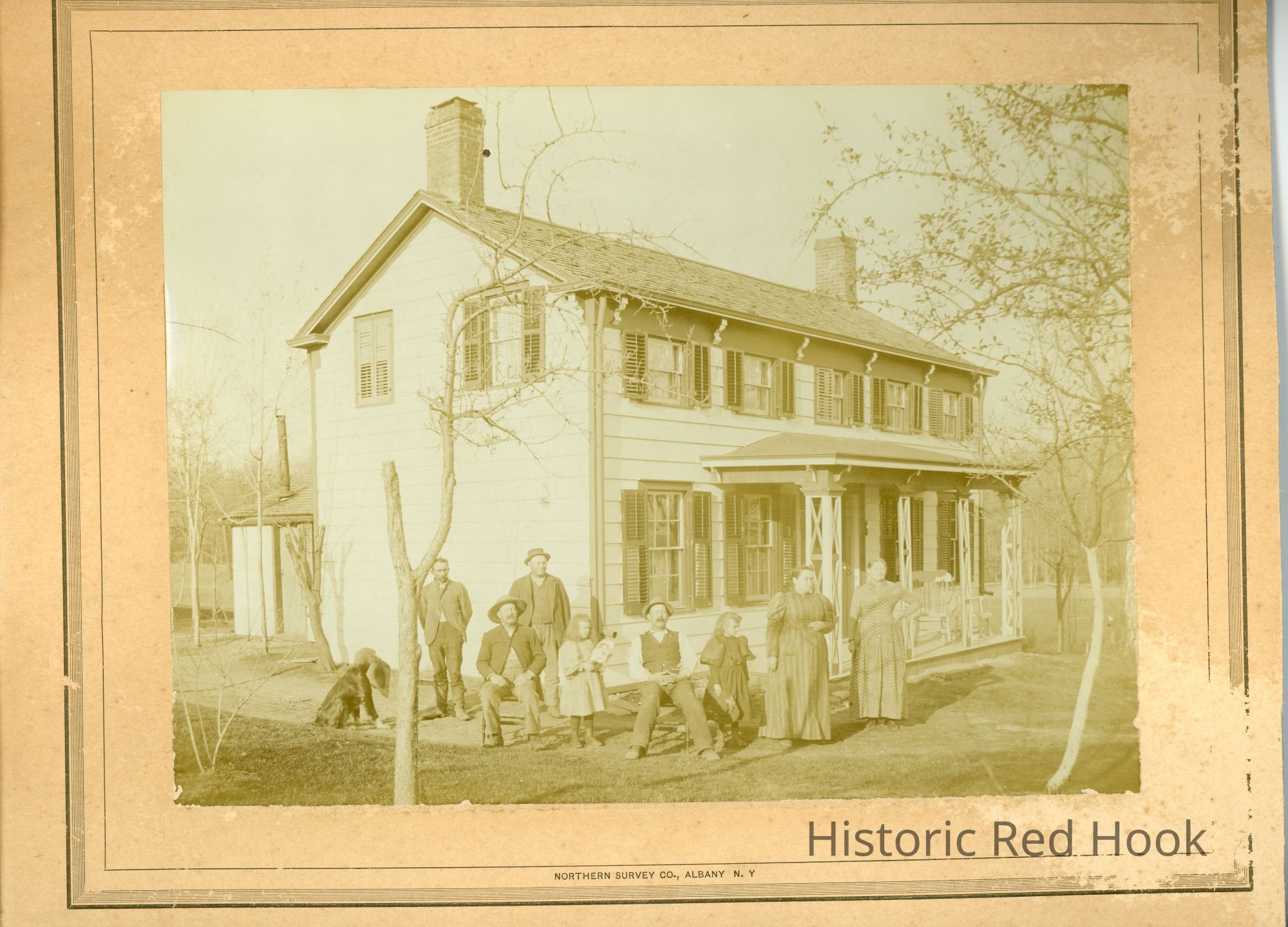 Oversize photograph on cardboard of Minkler family on their farm on West Kerley Corners Road. Four man, two girls, two women and a dog in front of the farmhouse. c. 1902?Photograph Details