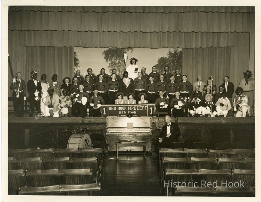 Photo of Minstrel show at Lyceum. Banner on stage says 'Red Hook Fire Dept, Red Hook, NY'. On either side of group several men appearing wearing 'blackface.'Collection