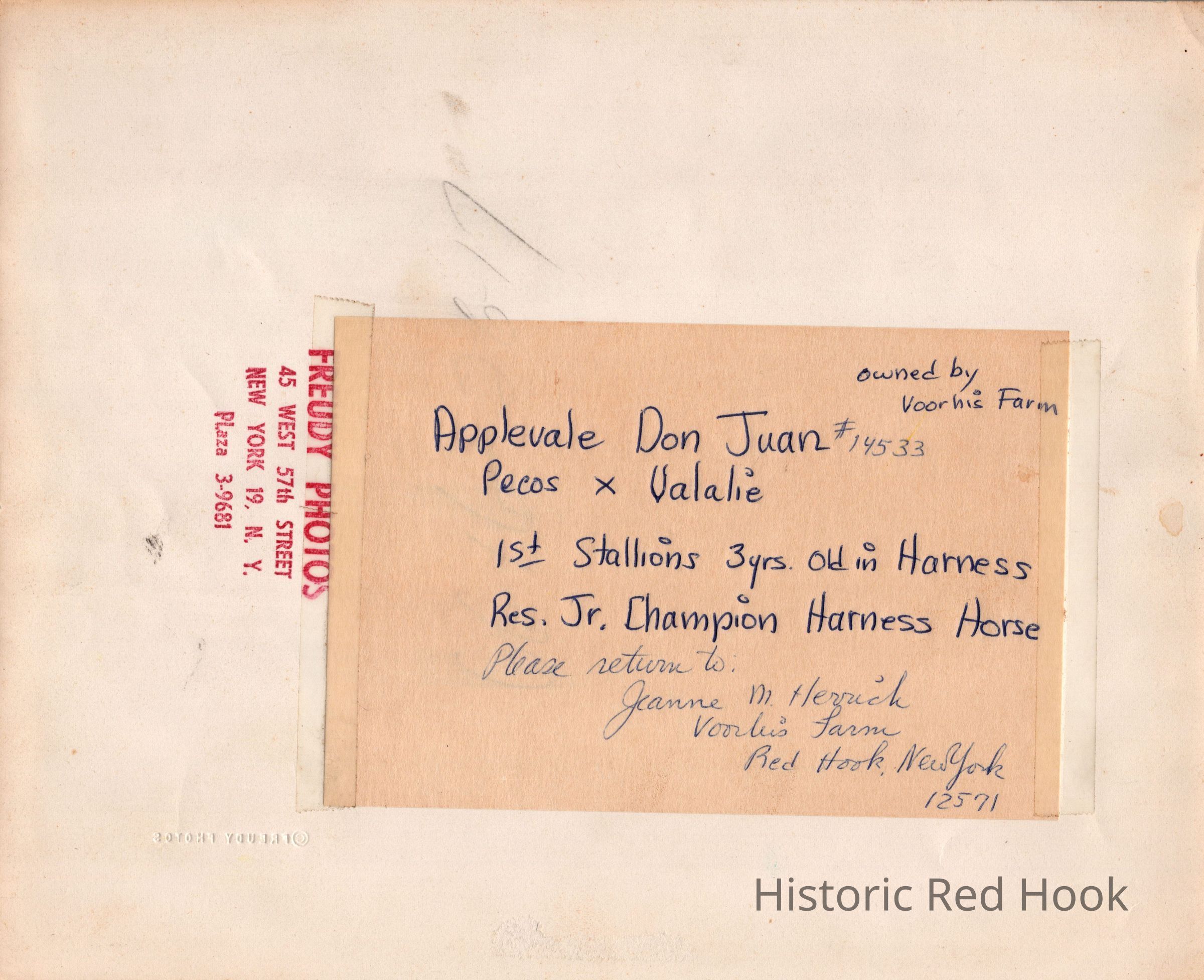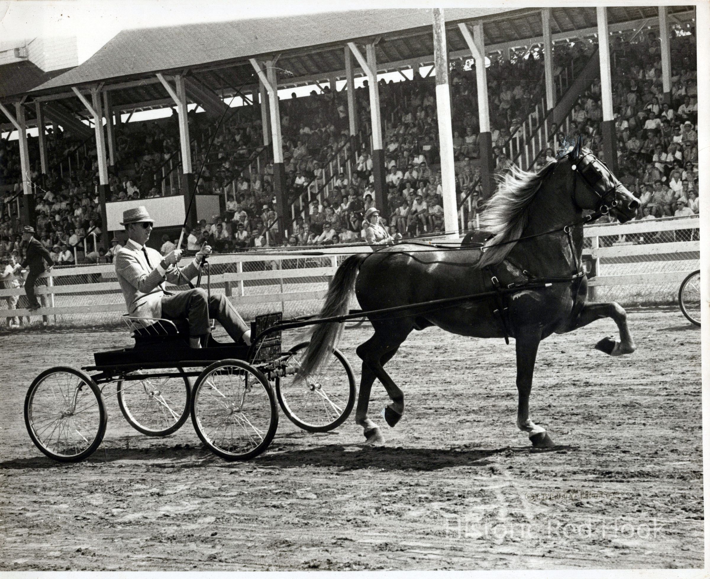 Morgan horse identified as 'Applevale Don Juan (Pecos X Valatie) pacing in harness at the Dutchess County Fair, c 1966. The horse took First Place in the Stallions 3-yr-olds in harness category and Reserve Champion in the Champion Harness Horse category. Owner is Gordon Voorhis. Driver is probably Fred Herrick. Gordon Voorhis co-founded the Voorhis-Thiebout Factory in Red Hook. The Voorhis farm "Applevale" was noted for breeding Morgan horses. The donor's father, Edward McNally, was president of the Voorhis-Thiebout Factory in Red Hook.Photograph Details