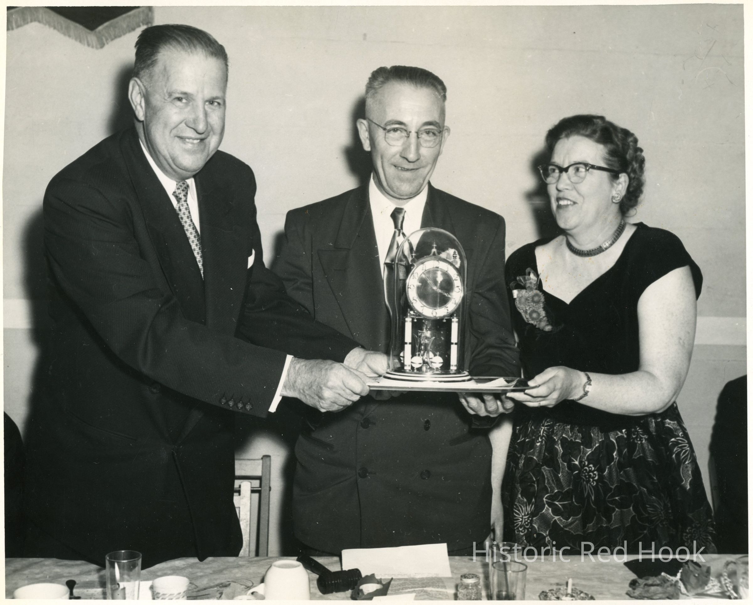 Lloyd Rockefeller presenting clock to B. D. Feller at mortgage burning and testimonial dinner, Mrs. Feller on right.Photograph Details