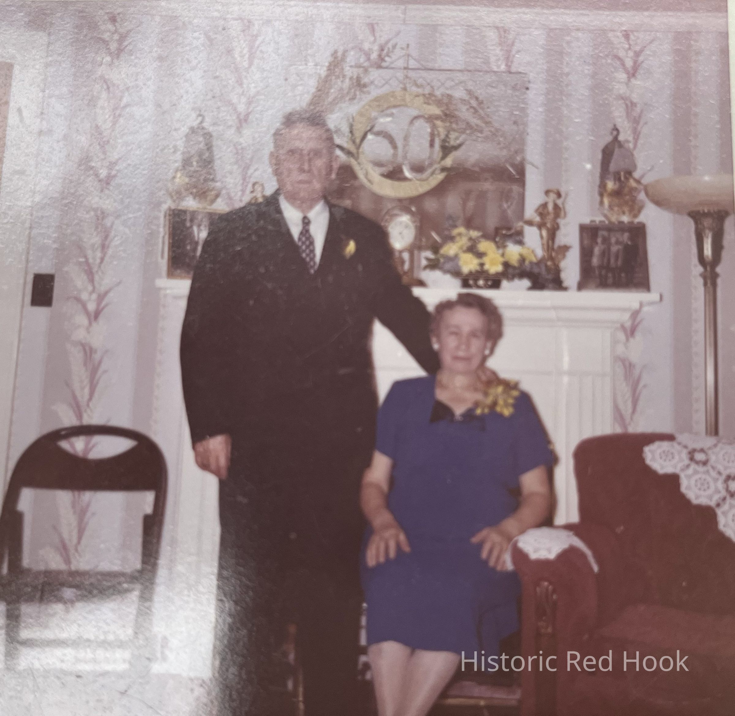 Color photograph of an older man and woman posed in front of a fireplace identified as Mr. & Mrs. William F. GorrayPhotograph Details