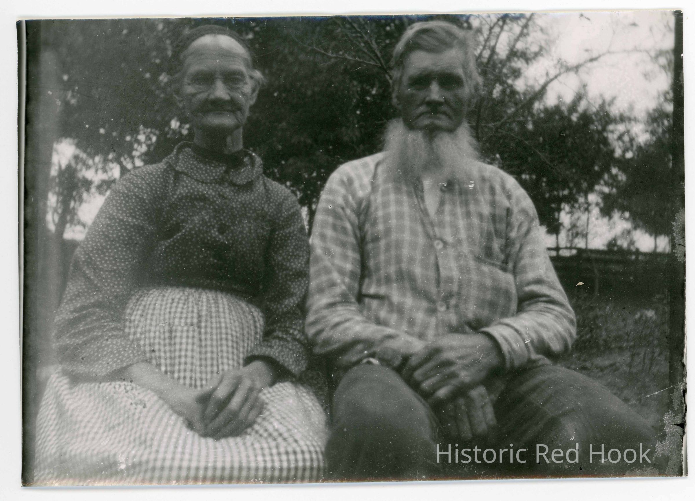 Informal photo of an older man and woman seated outdoors posed iin front of trees identified as L. Dutcher & wife.Photograph Details