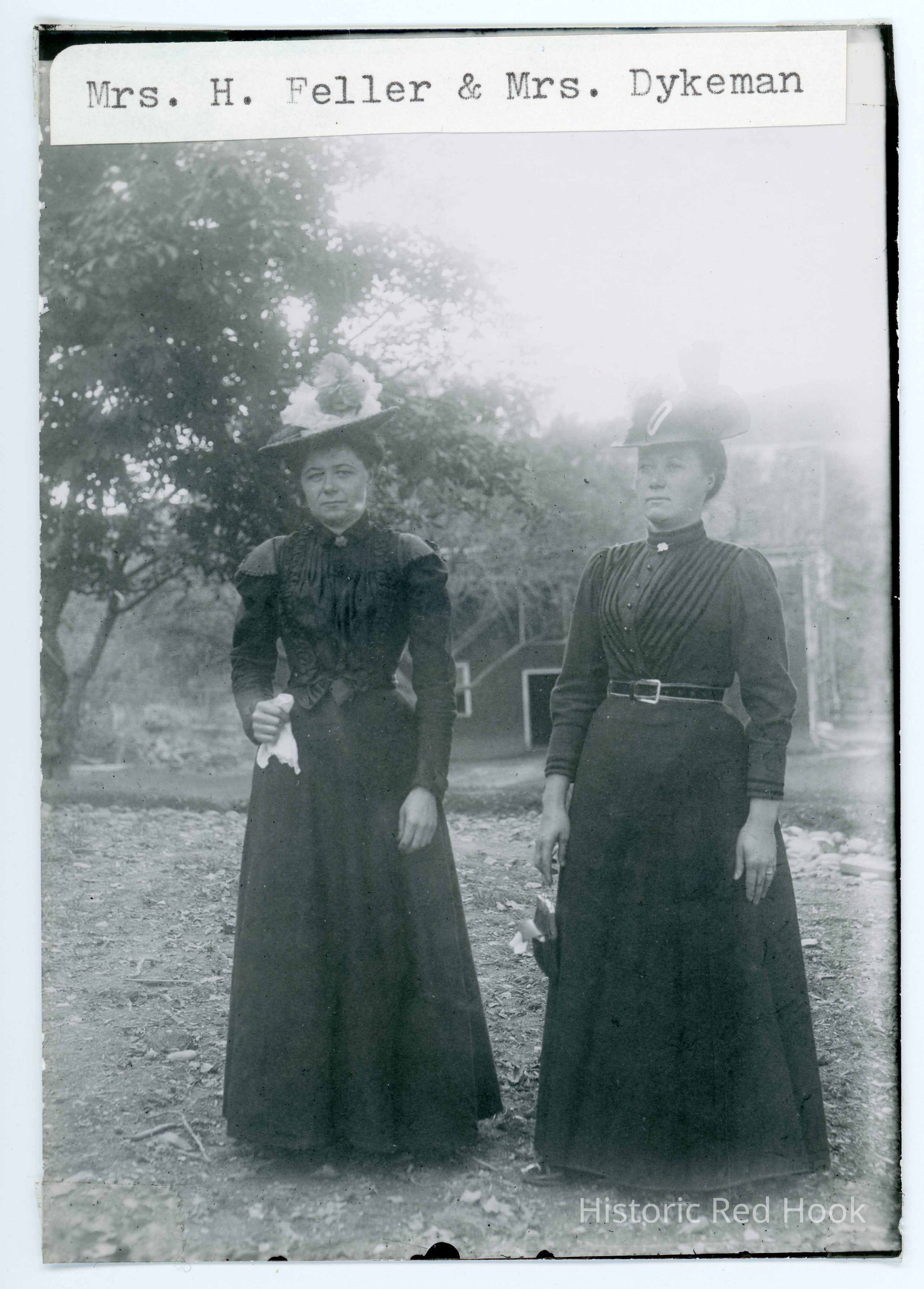 Posed photograph of two women standing outdoors in front of a building identified as Mrs. H. Feller & Mrs. Dykeman-WS Teator glass negative 2014.008.073; #4 Family & Friends reversed.Collection