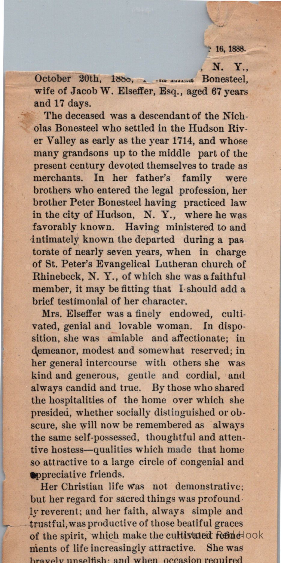 A newsprint article for Mrs. Jacob W. Elseffer, after her death highlighting her life.