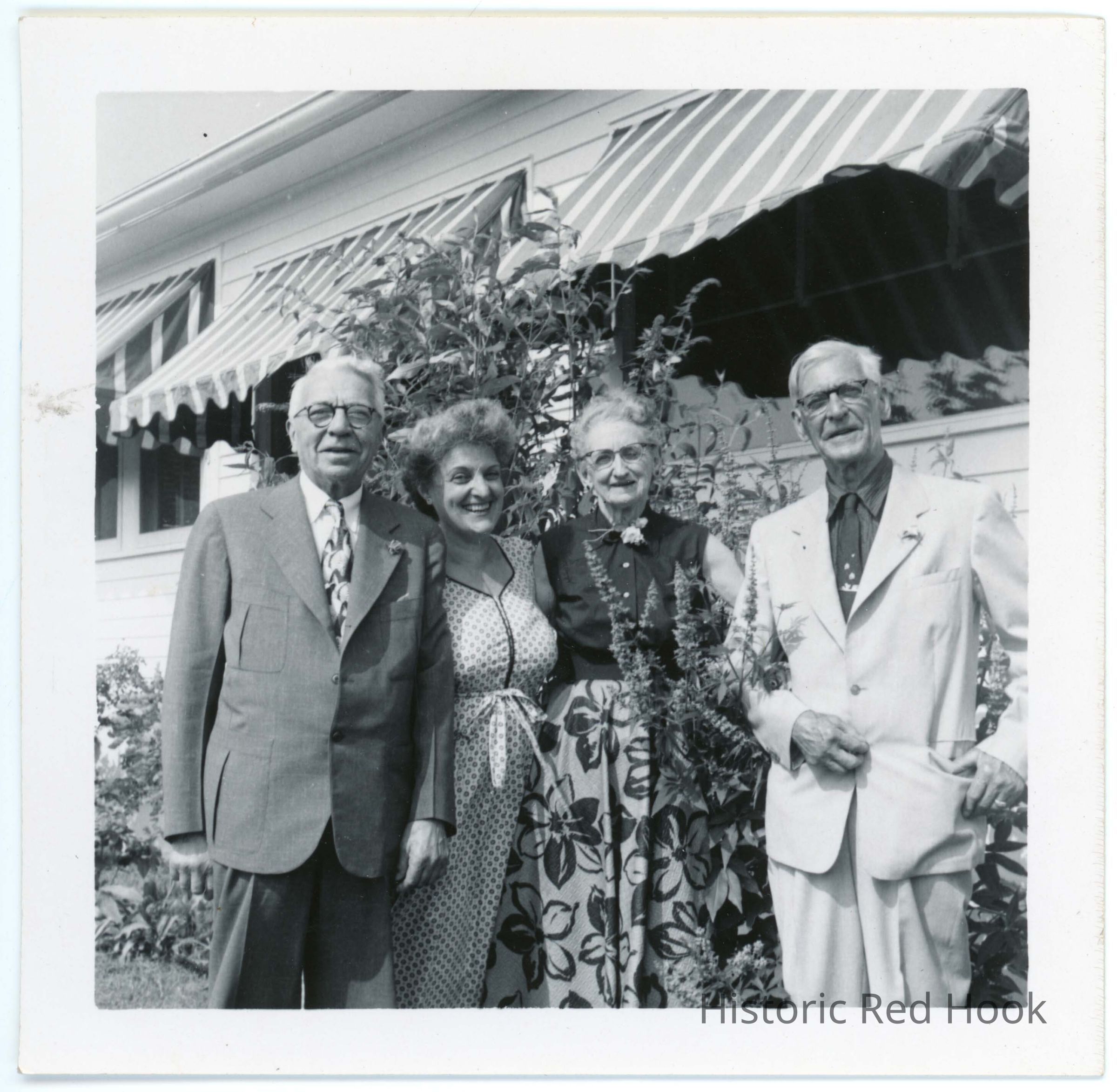 Four people standing in front of hotel. Written on back: L-R: Unknown, Mrs. Howard (Olive B) Laib, Mrs. Jane Vigeant, Dr. Joe Vigeant. about 1950. Stamped on back: H. L. Laib, Germantown, N.Y.Photograph Details