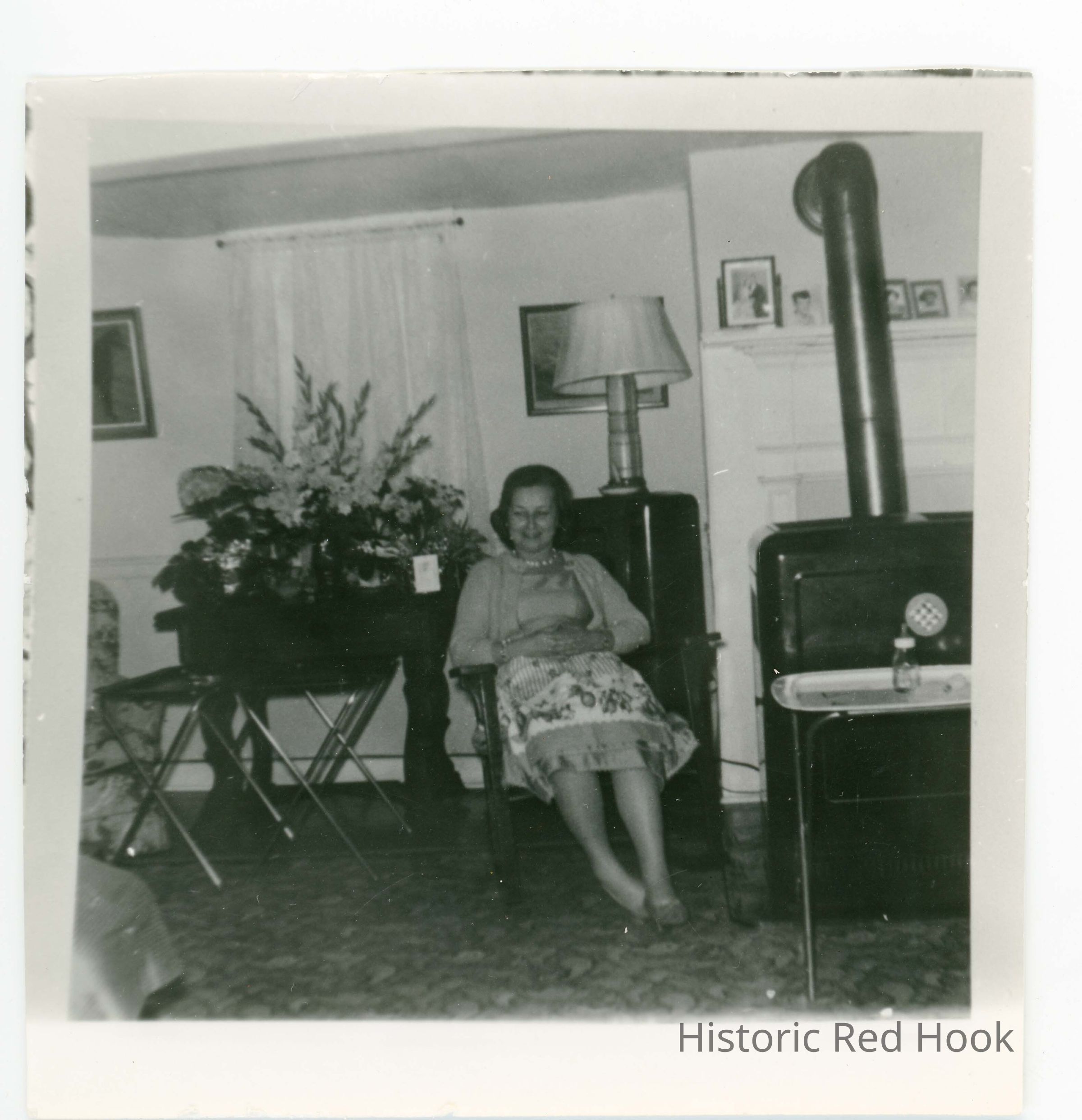 Mrs. Raymond Pulver, seated room 102, northwest corner, c 1964, # 4 in Historic Structures Report.Photograph Details