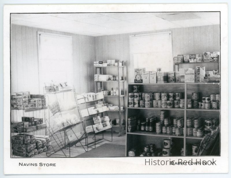 Store interior with view of goods on shelves. Navins Store, Barrytown, NY printed on front. Box for stamp on the back. Unsure whether this is the Post Office or Barn next to Navins House.