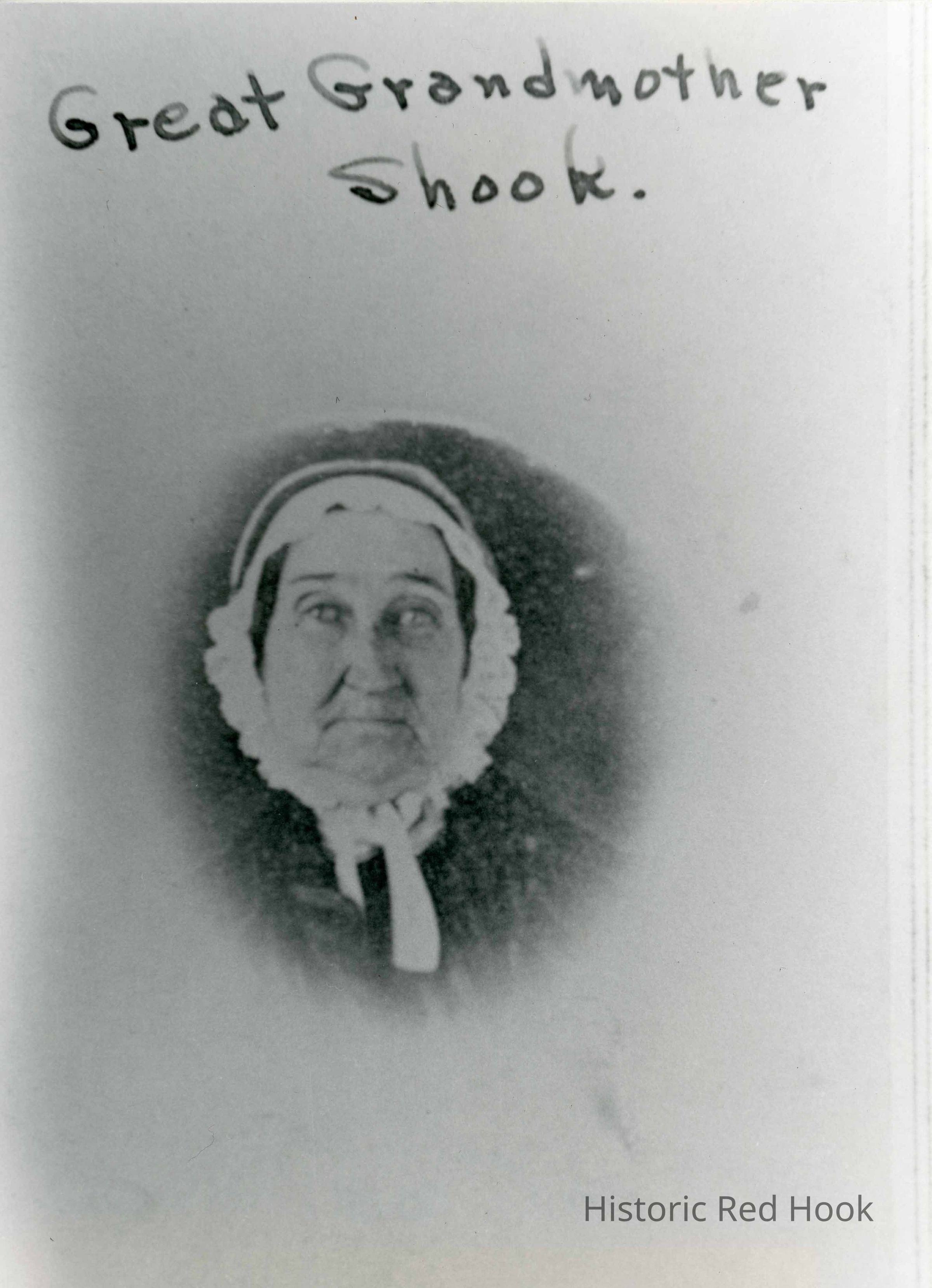Photo of woman in a cap identified as Nellie Shoemaker Shook