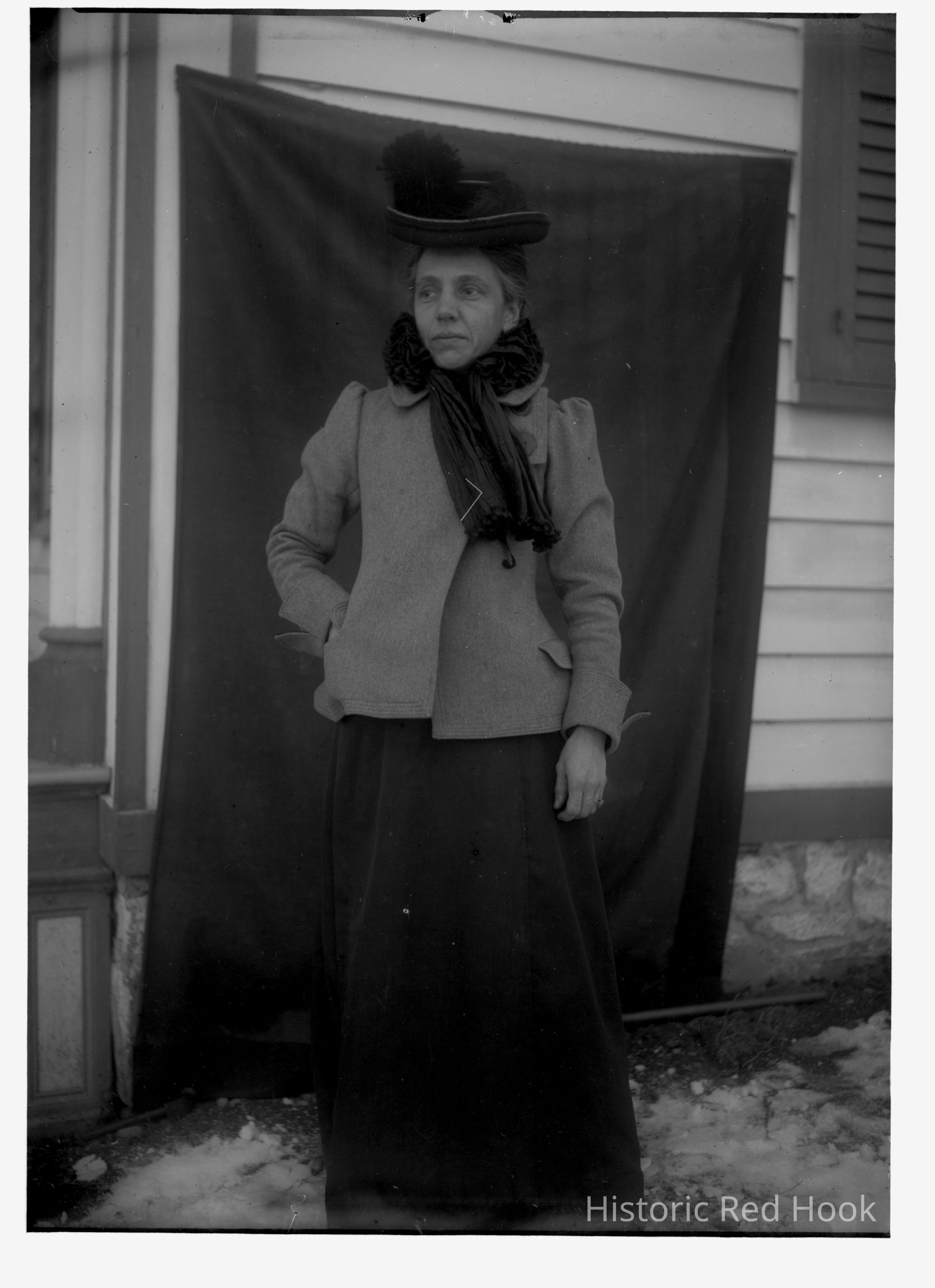 Nena Teator with hat and scarf standing in front of black cloth hung outside house, 1902Photograph Details