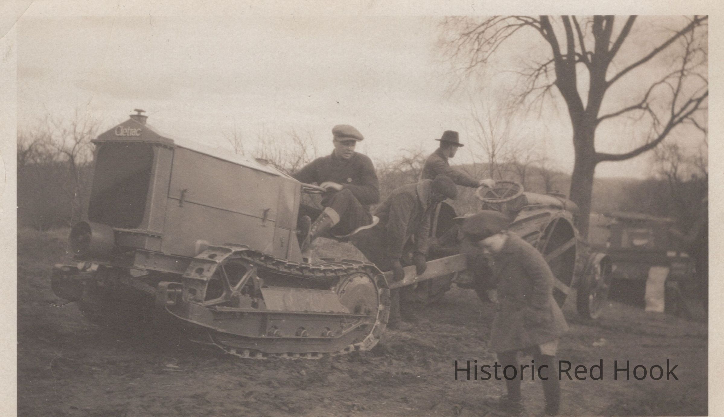 Three men and a boy with a "New Cleveland Tractor" Nov, 1925, pulling another tractor.