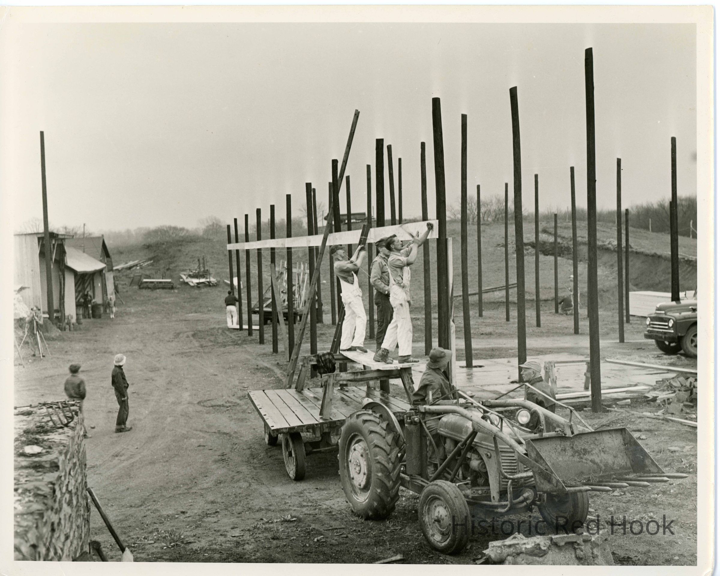 Barn-raising on Thomson property. Workers hammering side support while Norm Thomson on a tractor looks on. Photo is stamped April 23, 1954 on back.Photograph Details