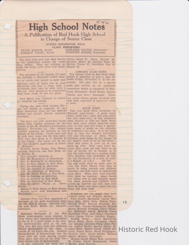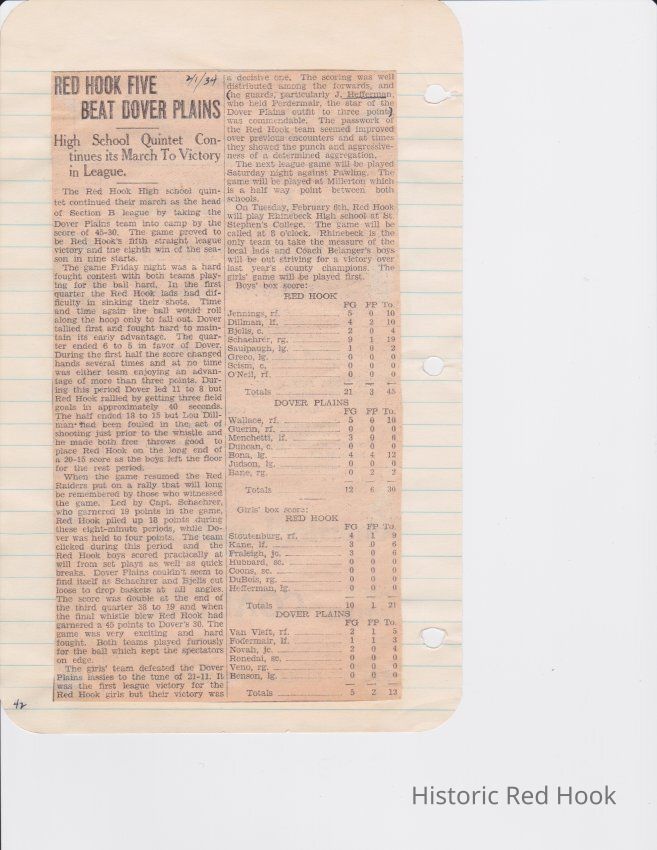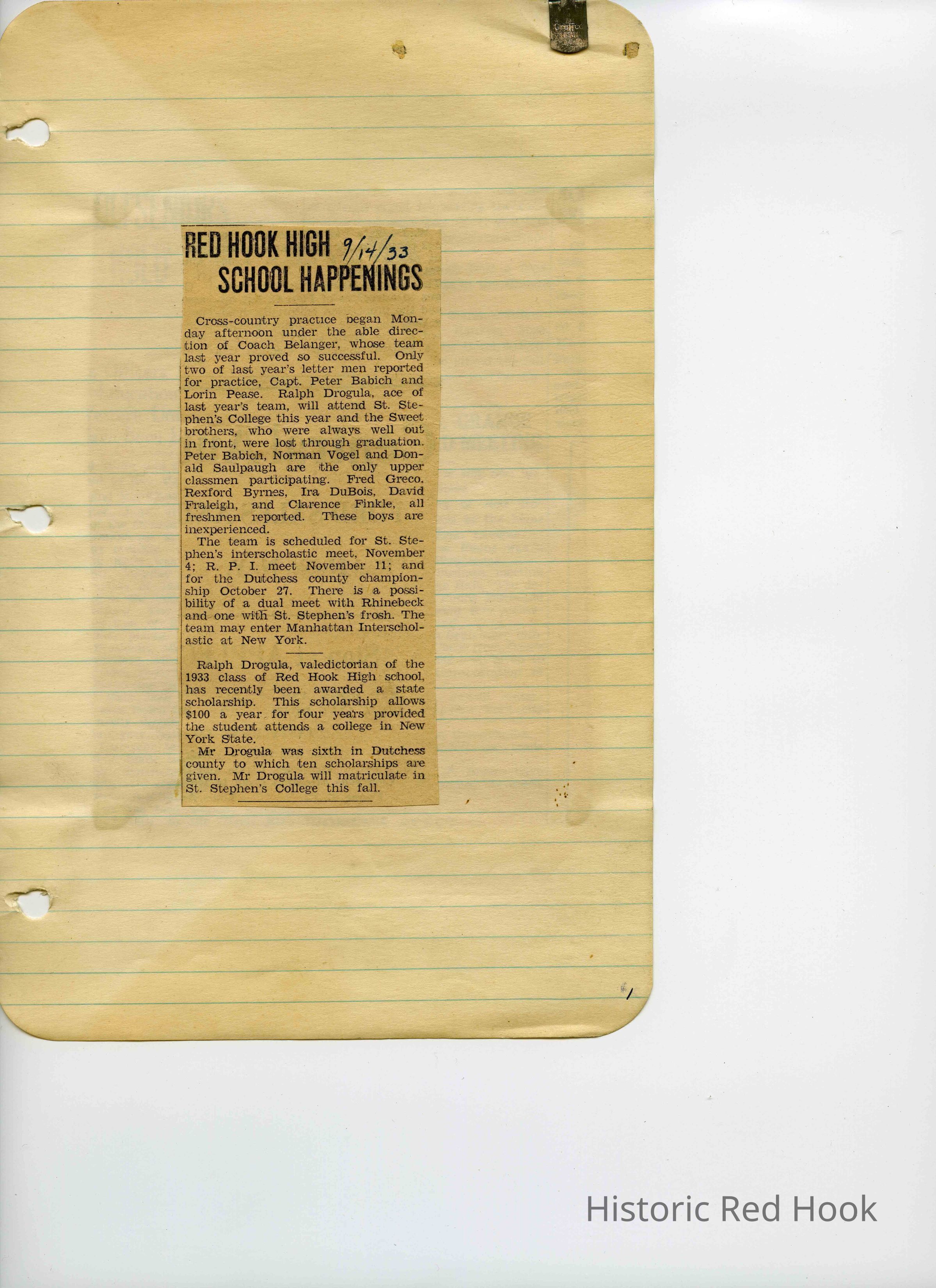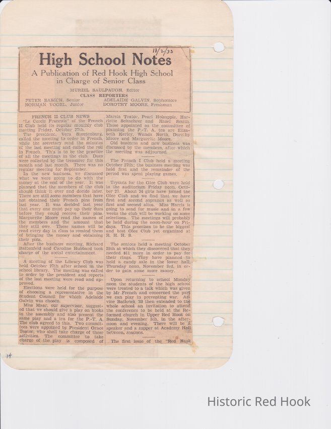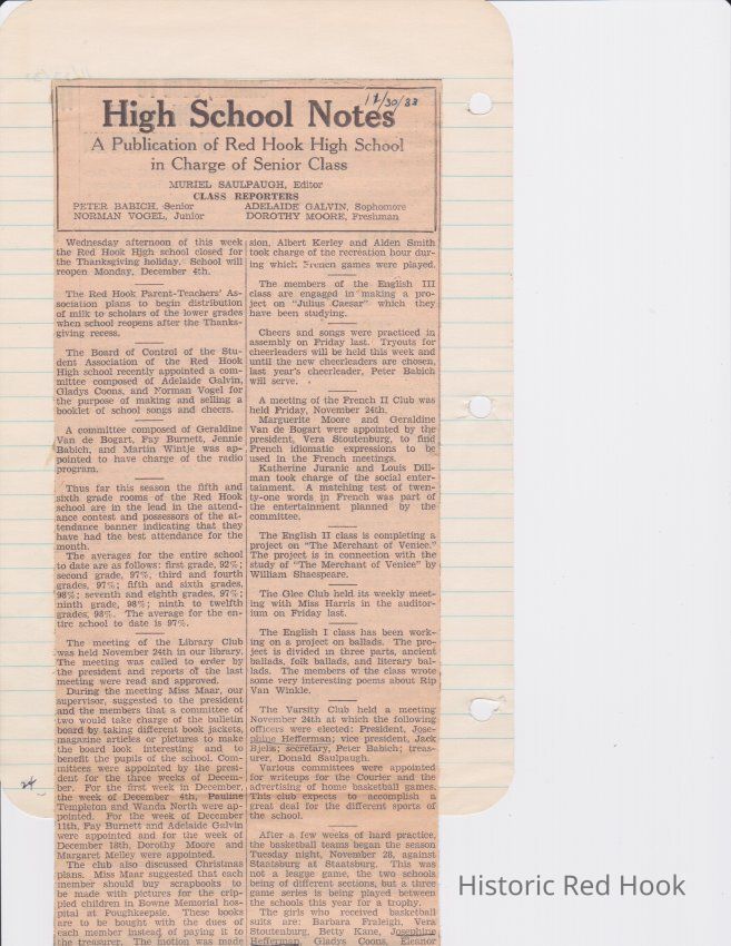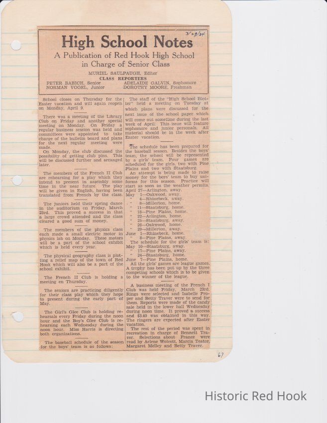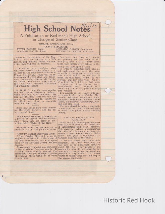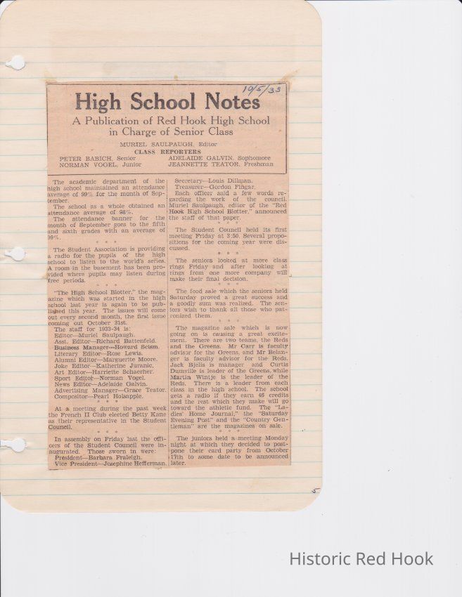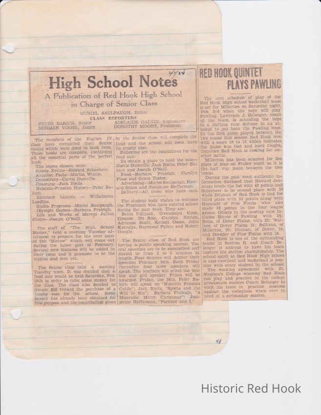 Scrapbook put together by Norman Vogel. It contains newspaper clippings about school news and sports from Red Hook High School 1933-1934. It was given to Patsy Vogel by Norman's widow, Margaret Vogel.
