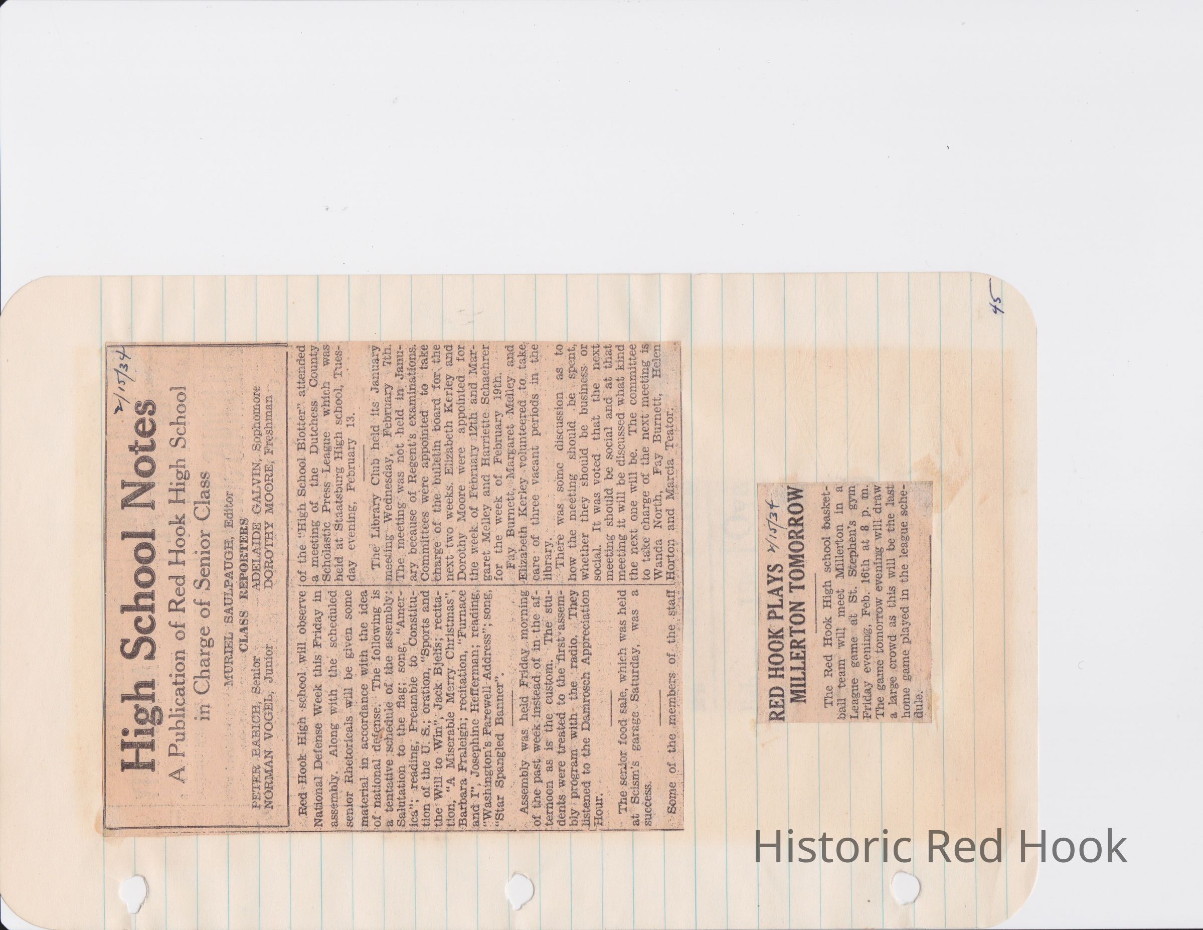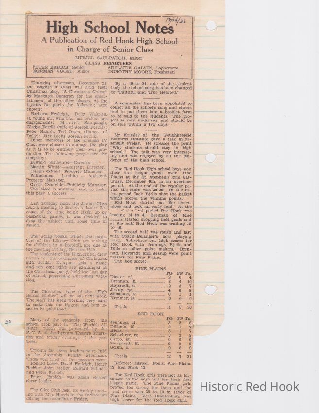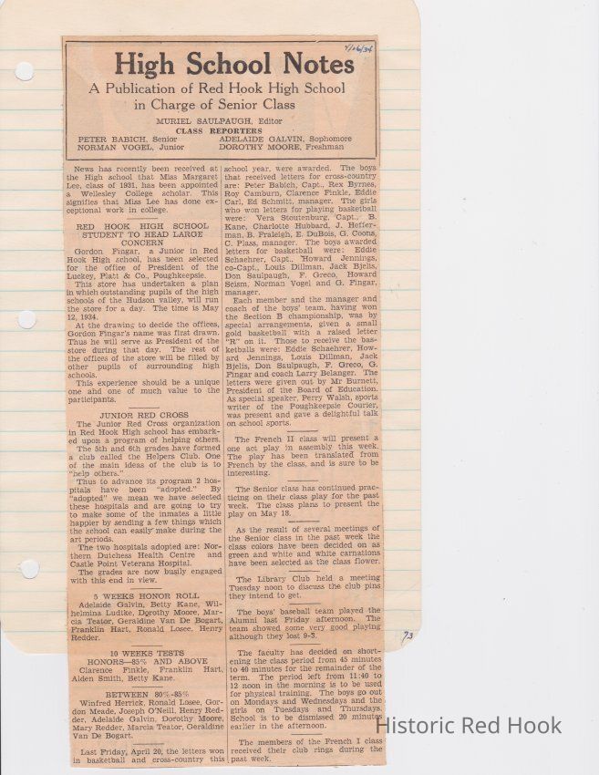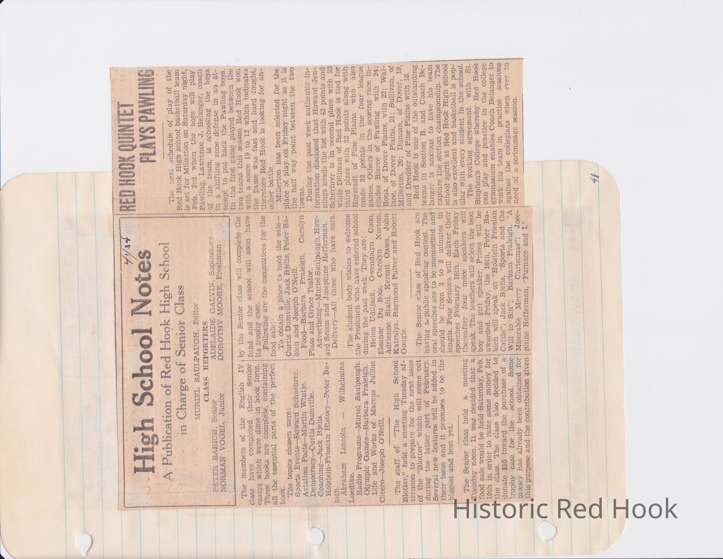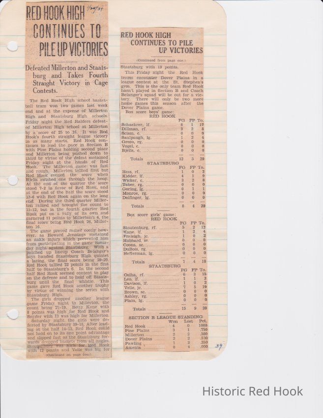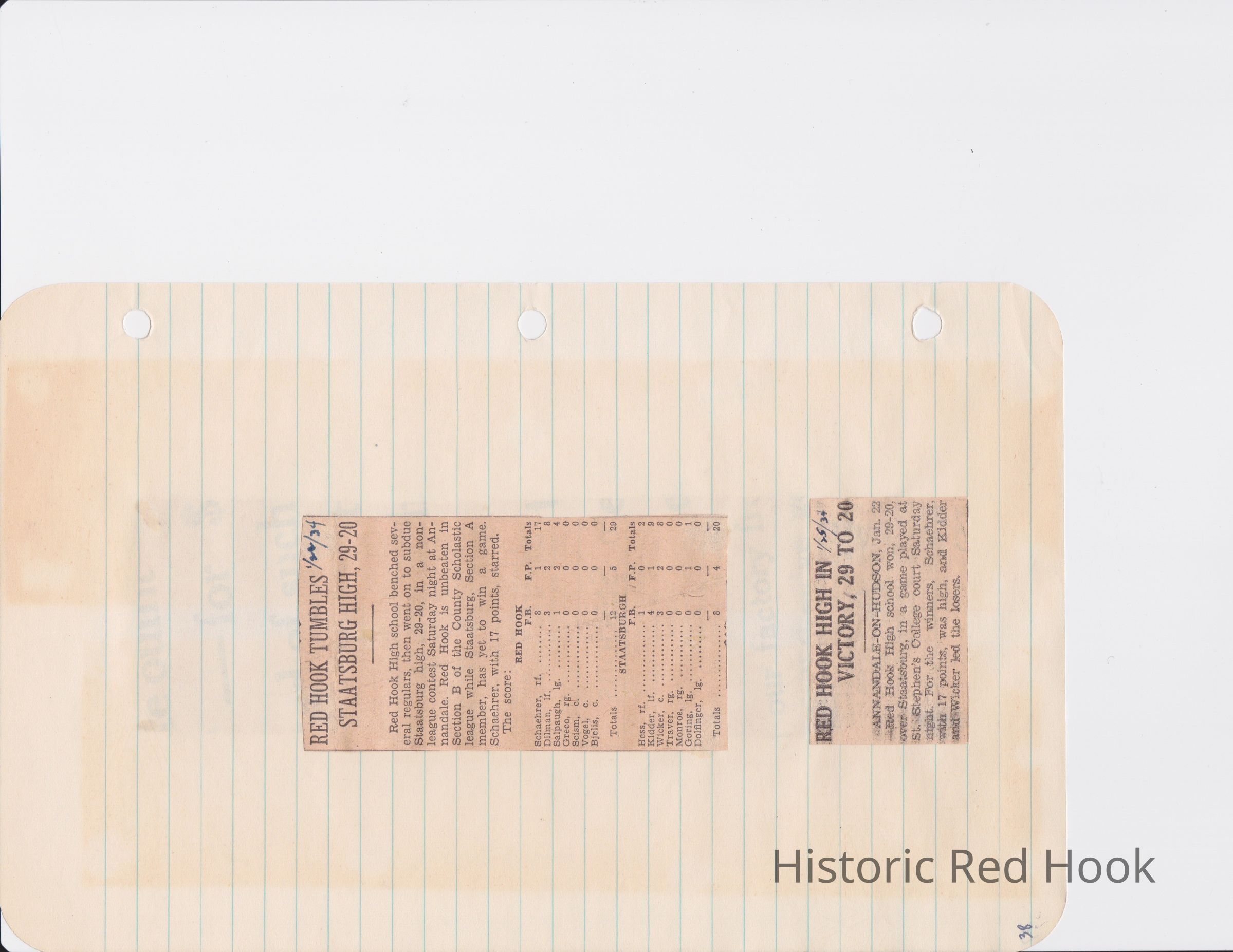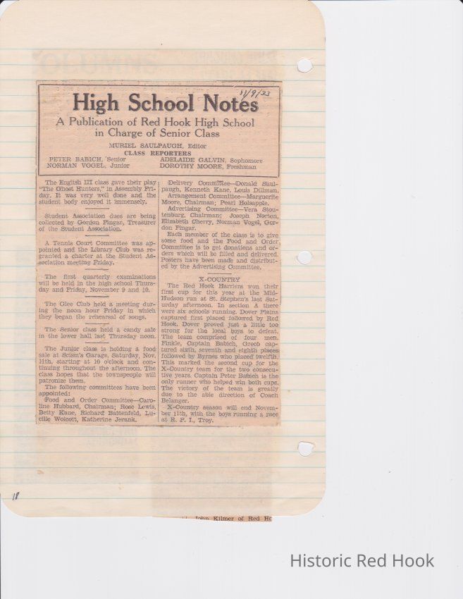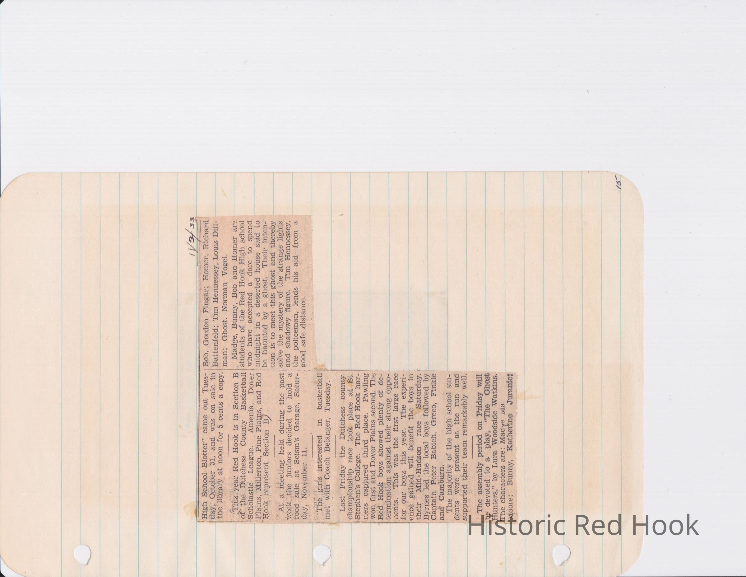 Scrapbook put together by Norman Vogel. It contains newspaper clippings about school news and sports from Red Hook High School 1933-1934. It was given to Patsy Vogel by Norman's widow, Margaret Vogel.
