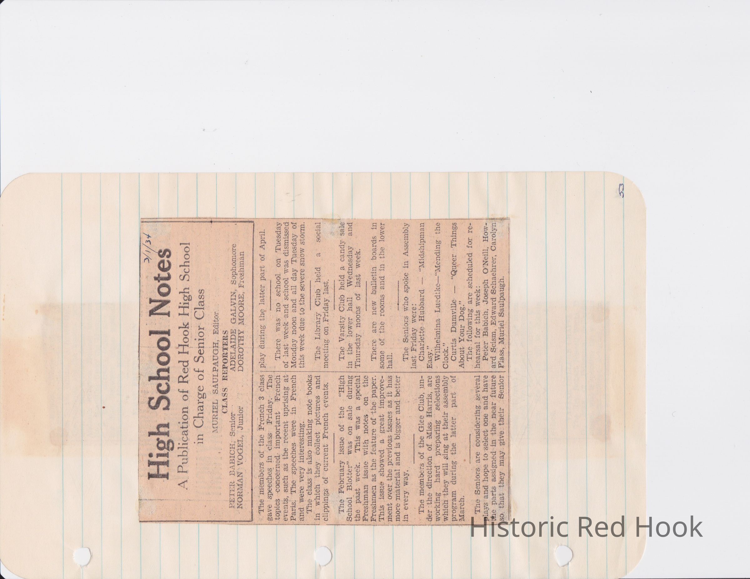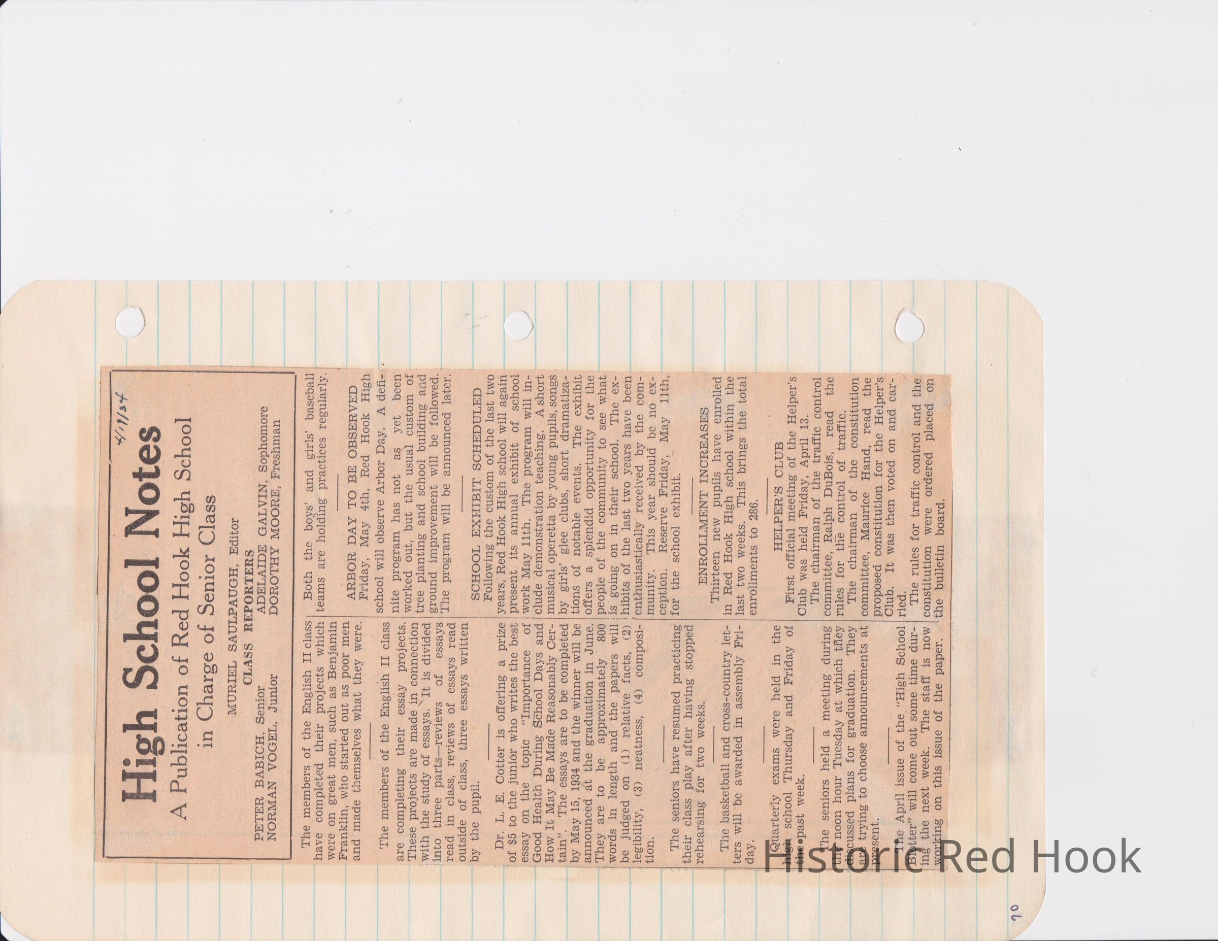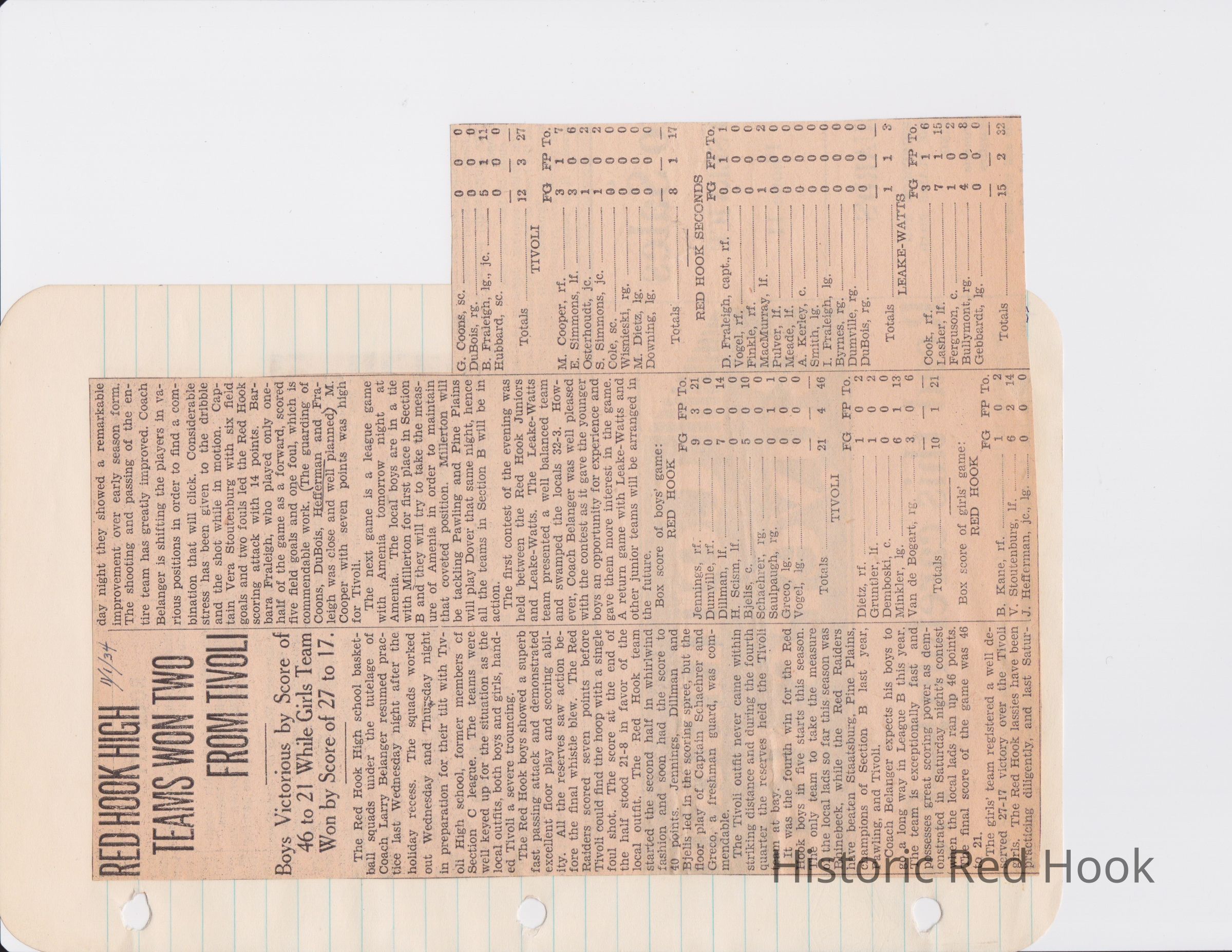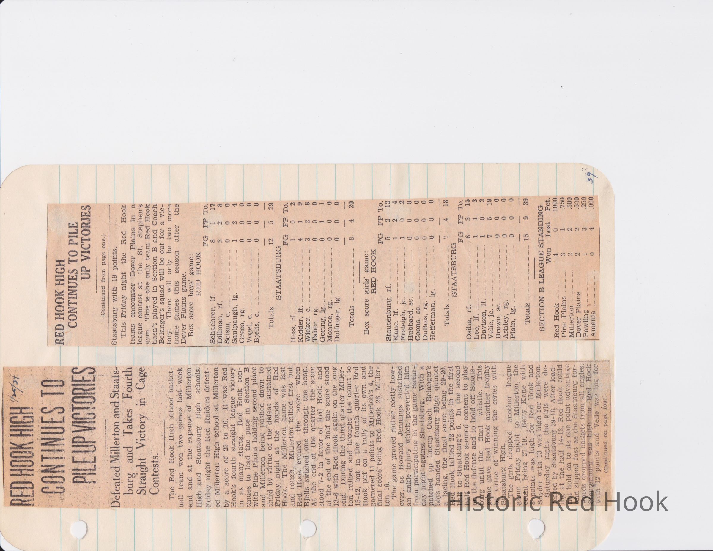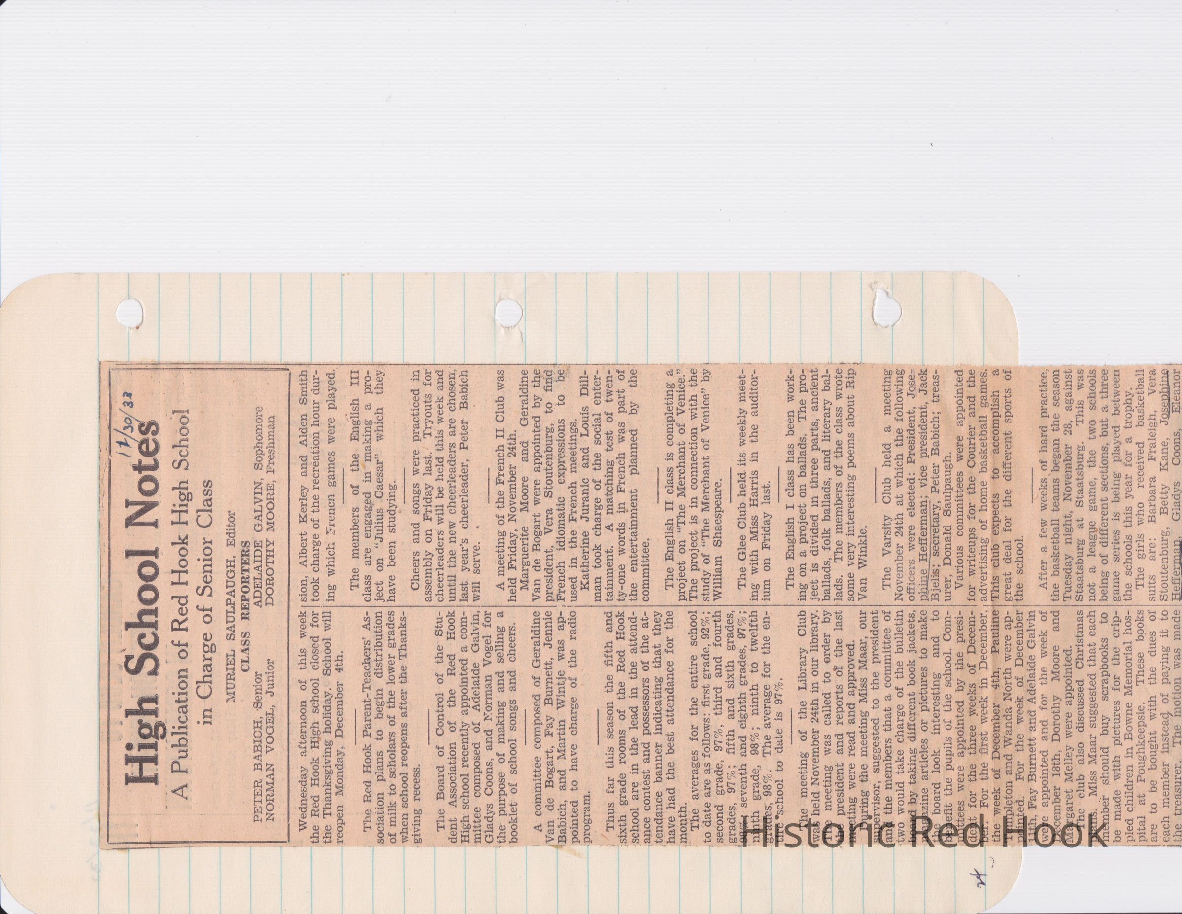 Scrapbook put together by Norman Vogel. It contains newspaper clippings about school news and sports from Red Hook High School 1933-1934. It was given to Patsy Vogel by Norman's widow, Margaret Vogel.