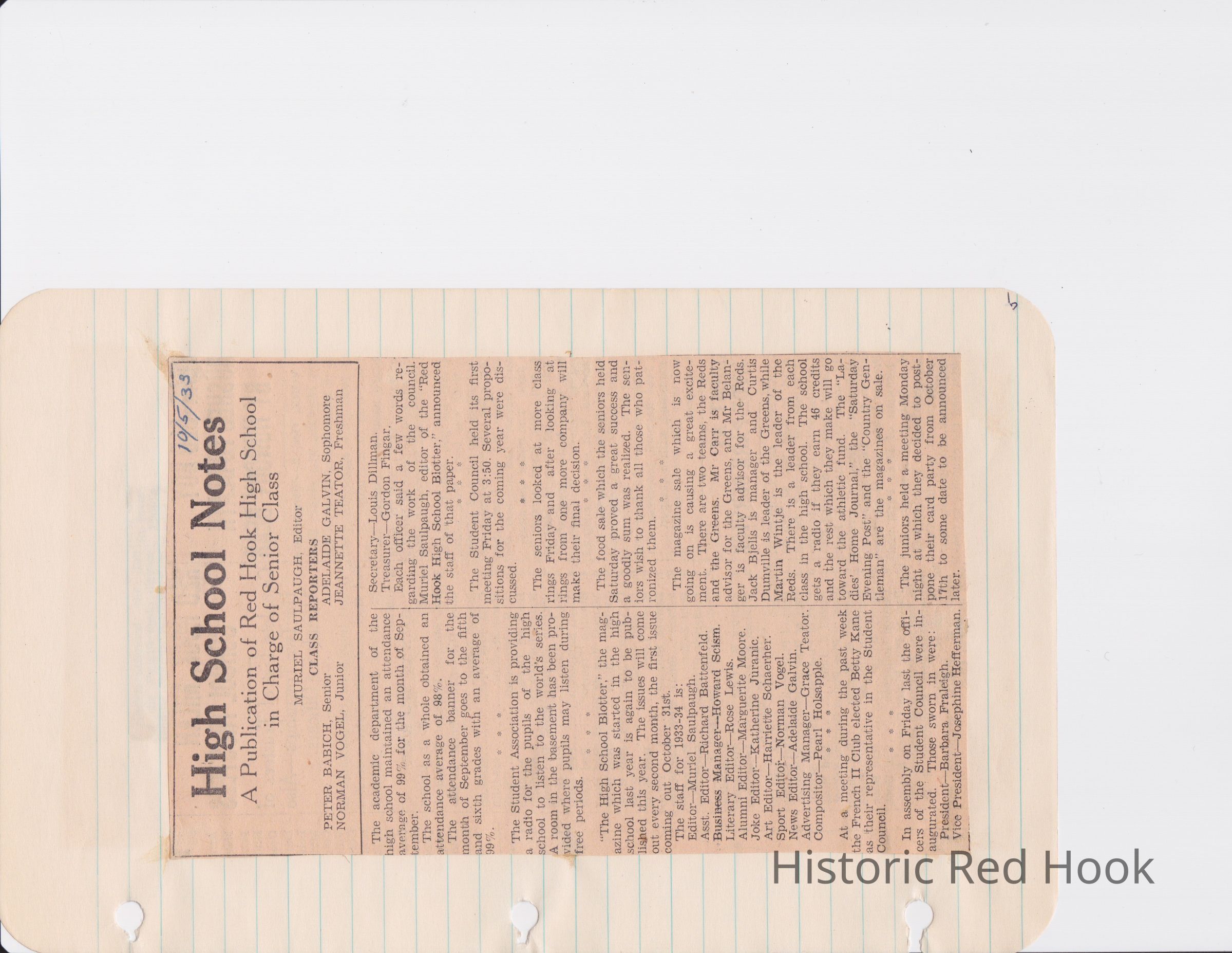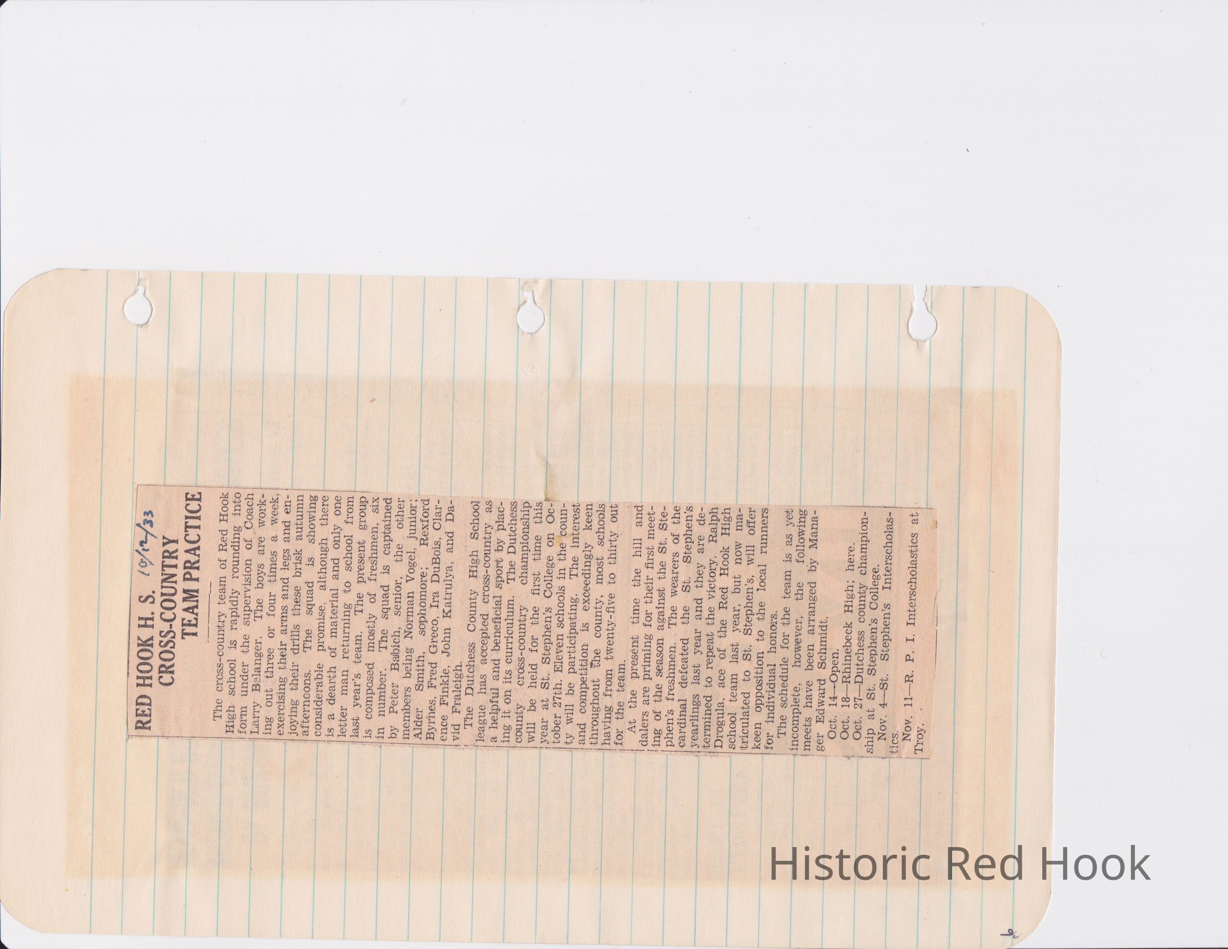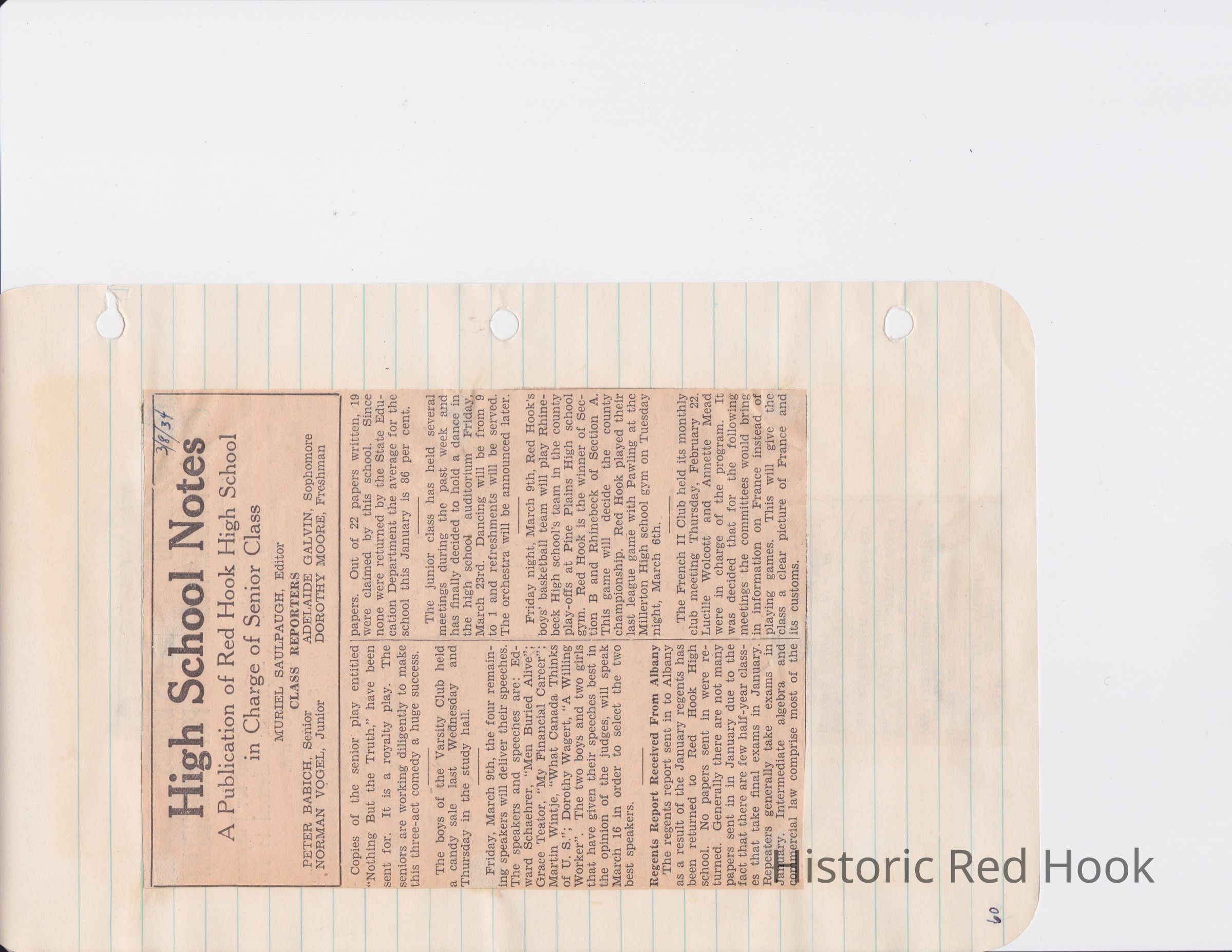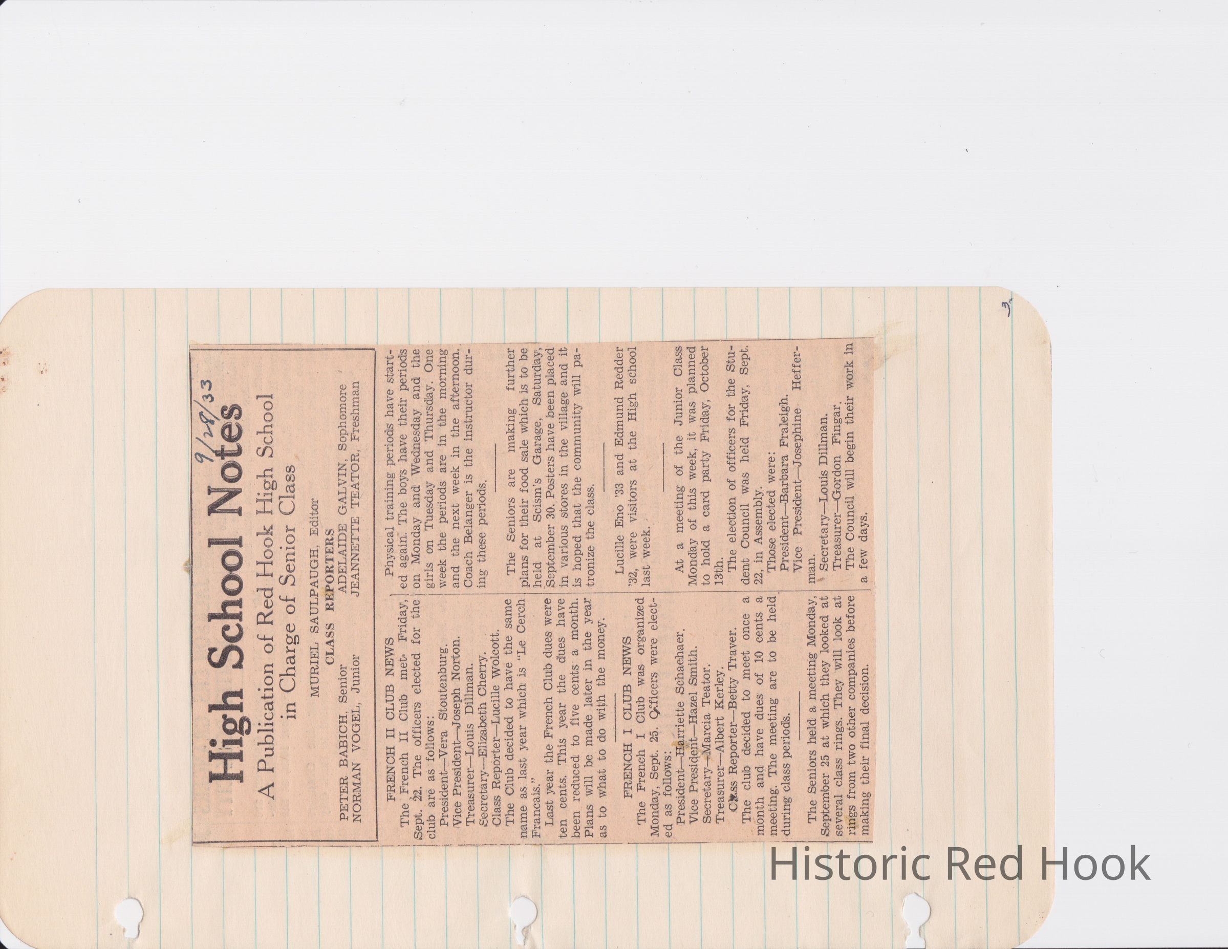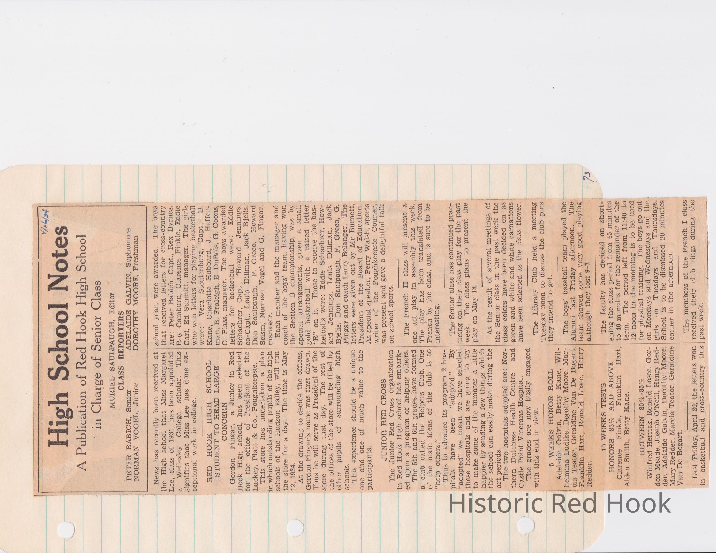 Scrapbook put together by Norman Vogel. It contains newspaper clippings about school news and sports from Red Hook High School 1933-1934. It was given to Patsy Vogel by Norman's widow, Margaret Vogel.