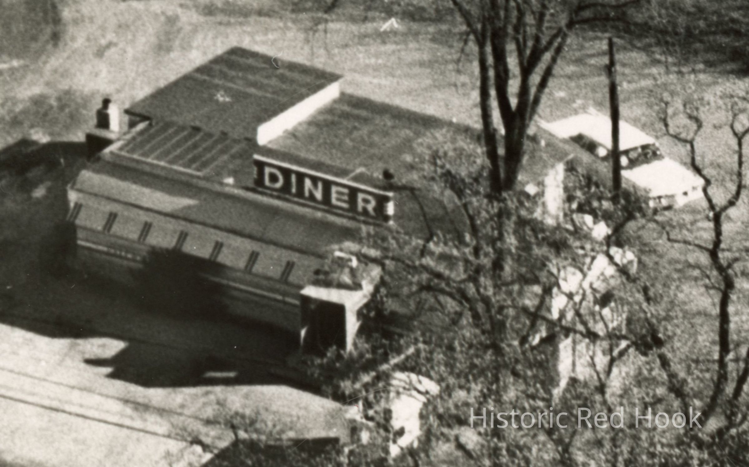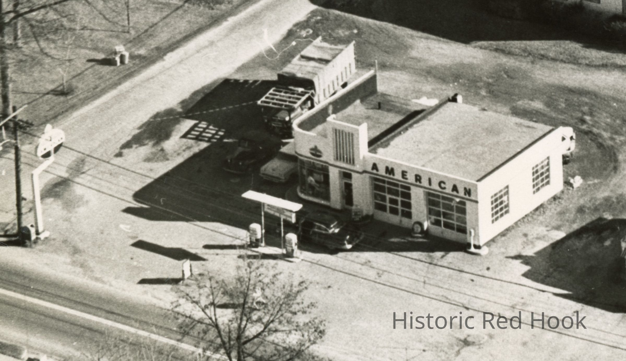 Visible, left to right along Broadway: the American Gas Station, a white ceramic tiled mid-century modern classic, later demolished and now where Stewart's stands; Red Hook Village Diner; Roy W. Scism residence.Photograph Details