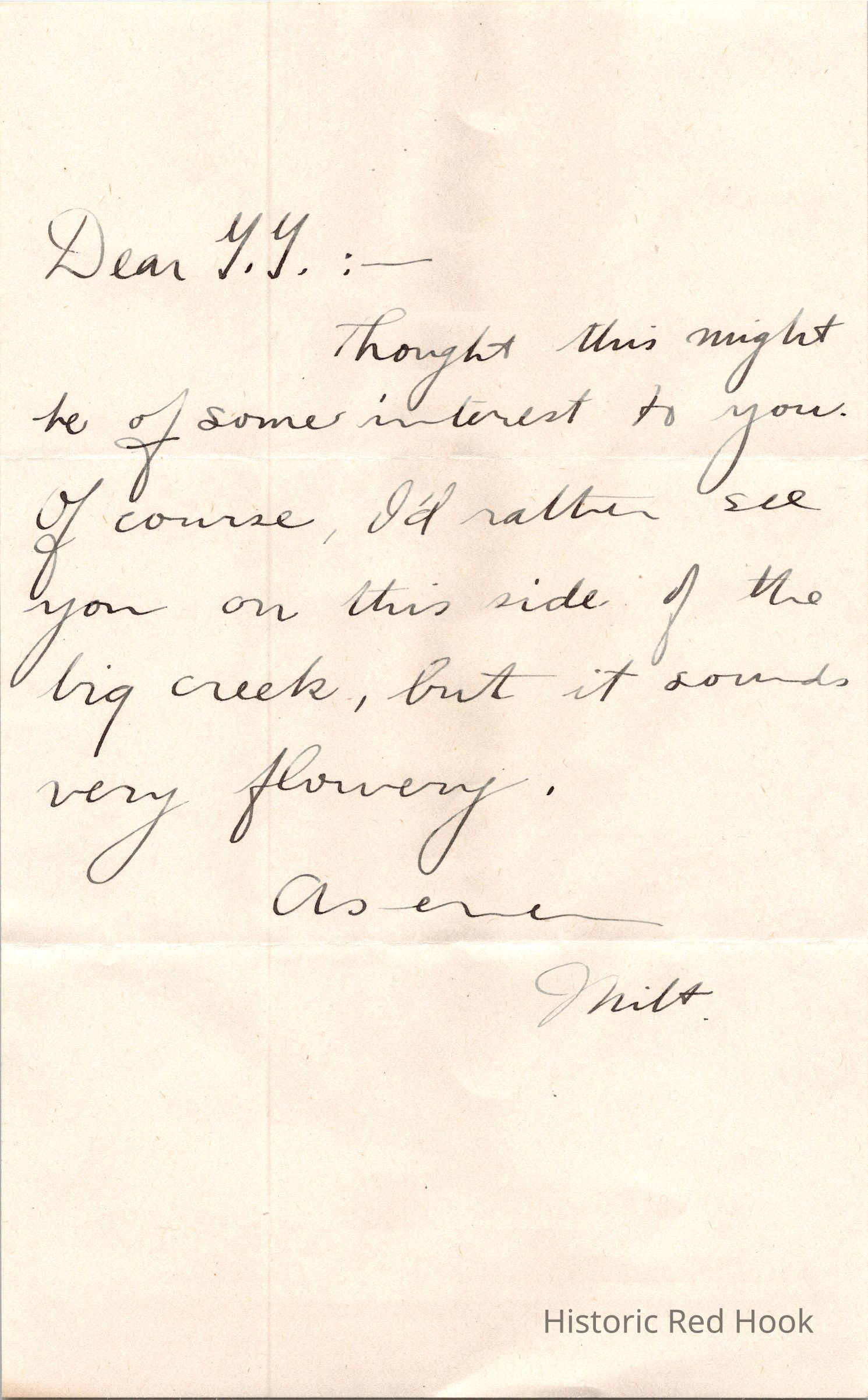 This undated note to Gordon Mead references a property of possible interest to him, but the writer “Milt” hopes that Mead stays on the writer’s “side of the creek”. (“Milt' is mentioned in 2024.7.162; W.S. Teator writes to Gordon Mead that “Milt” is making inquiries about a farm in the area, and is also preparing his thesis.) NOTE: “Milt” might by Milt Aldrich.