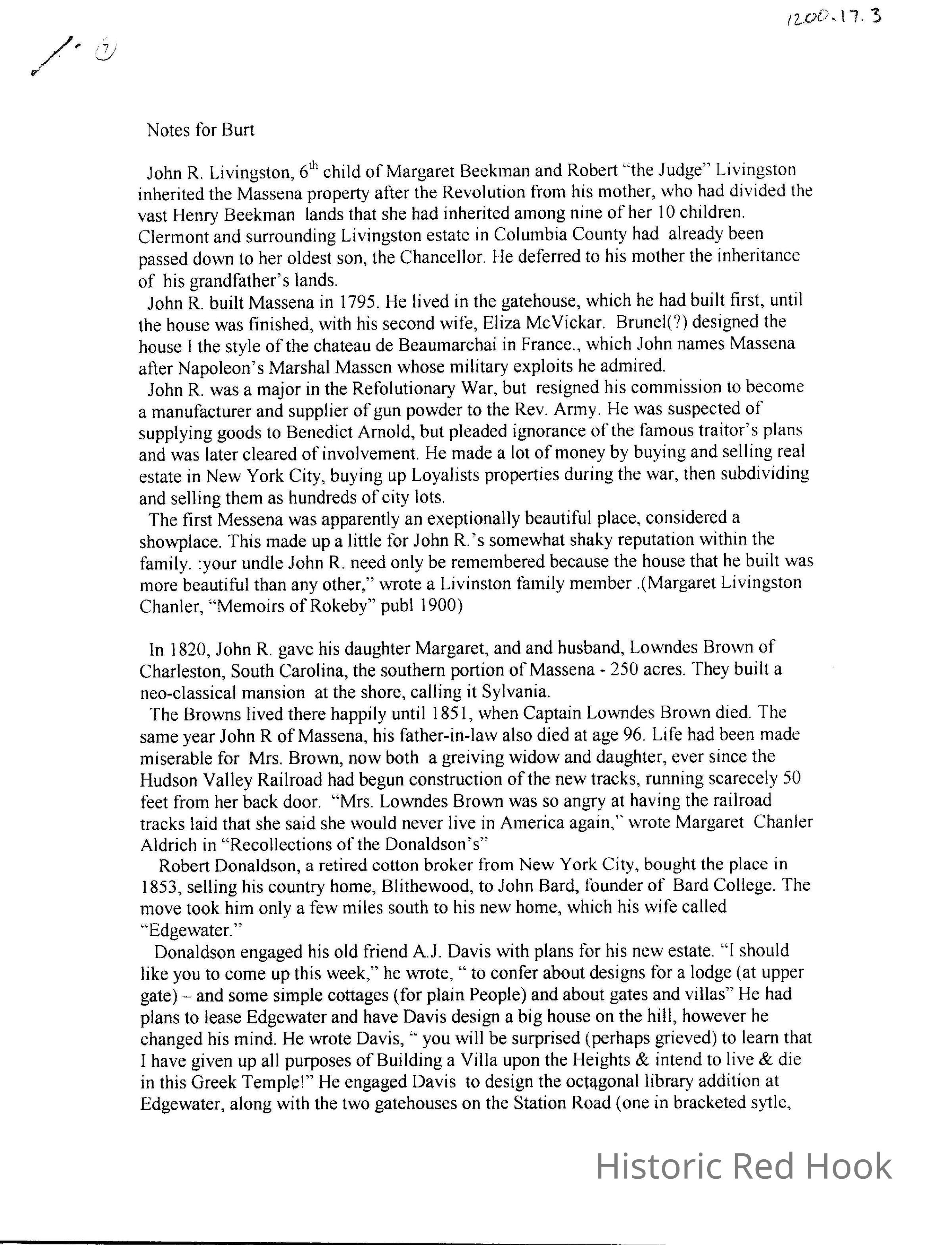 Notes on the ownership of Massena property from John R. Livingston to Robert Donaldson.Collection