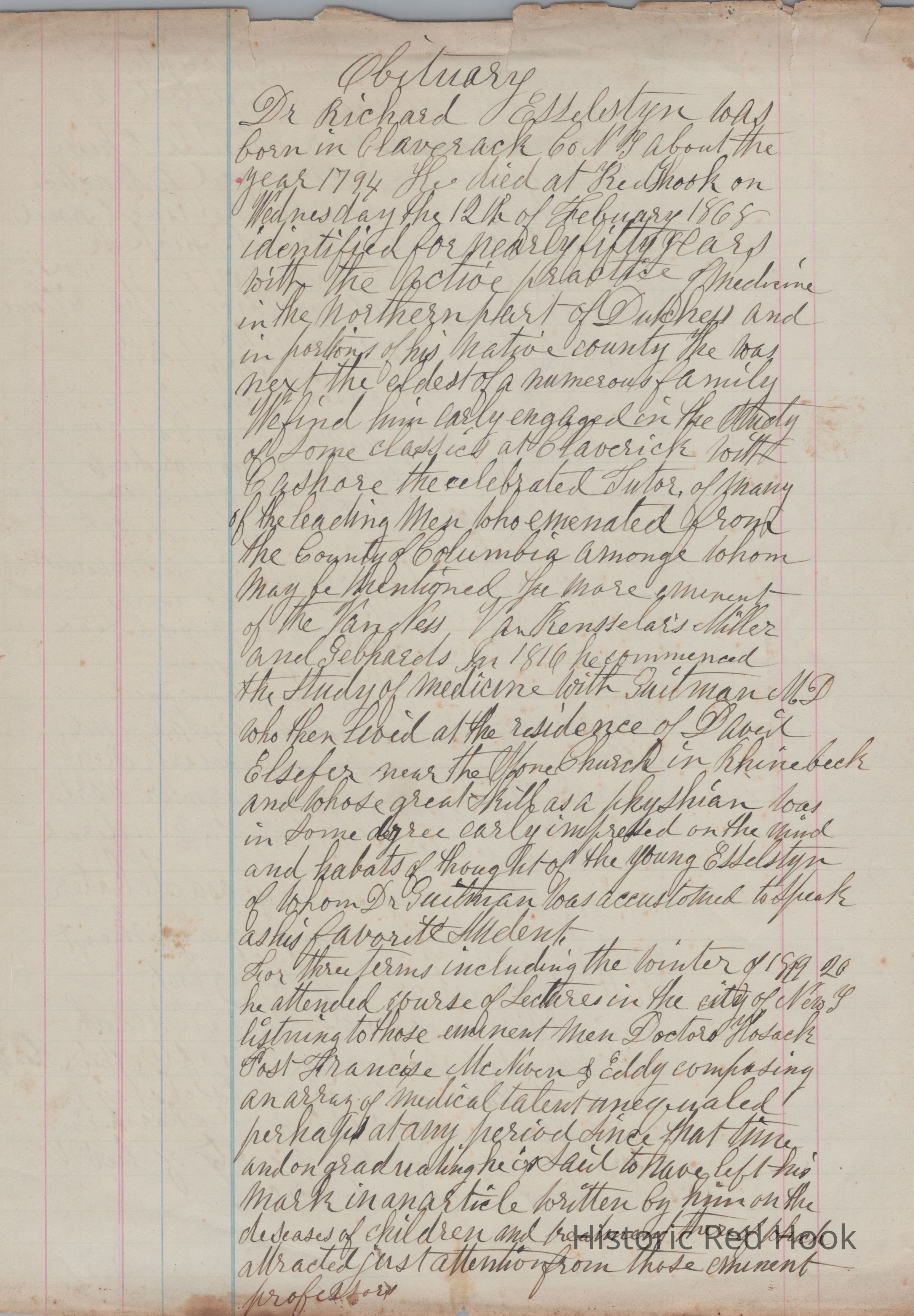 A two page handwritten obituary for the death of Dr. Richard Esselestyn at Red Hook, New York recounting his medical education and practice.