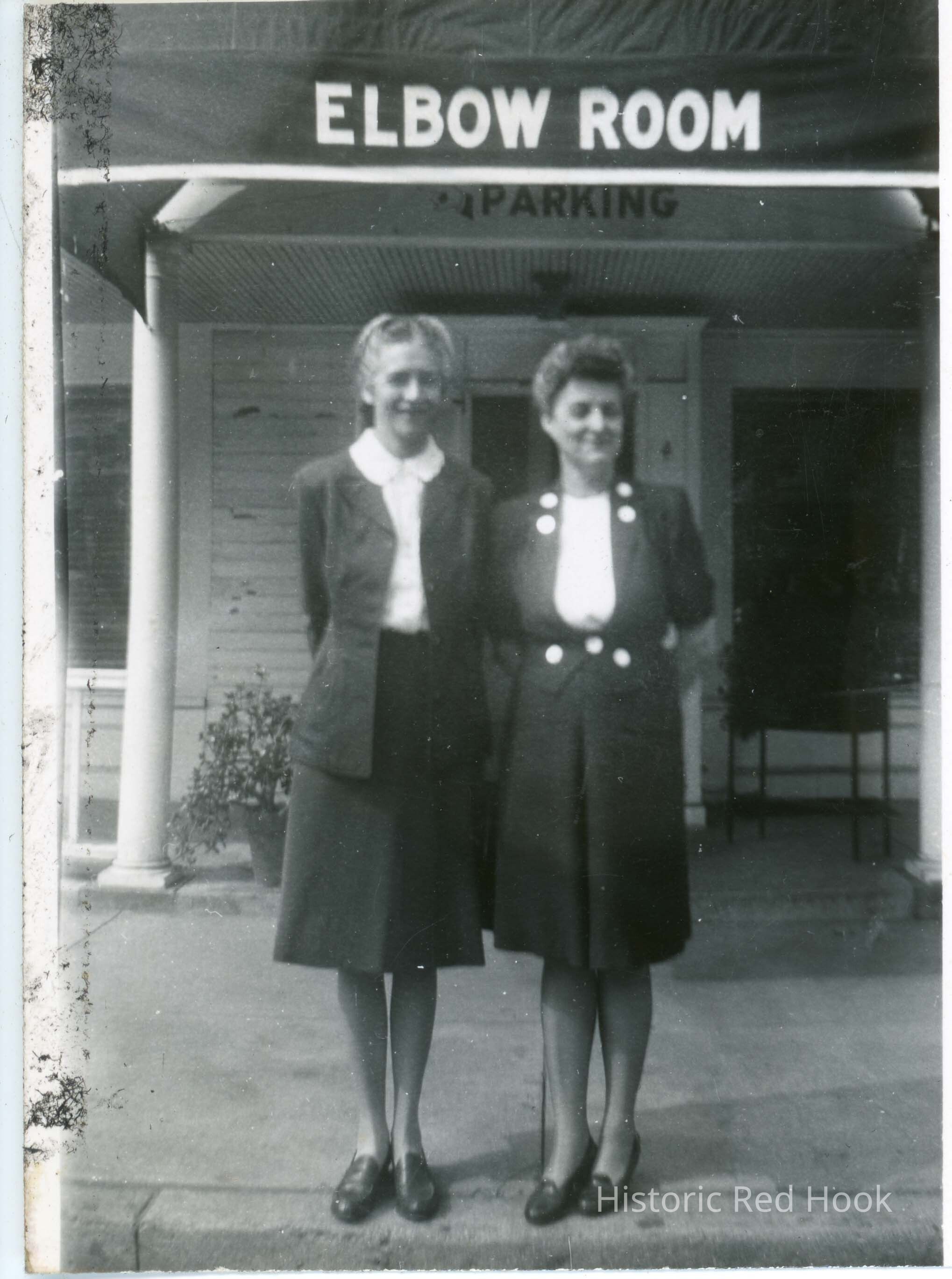 Olive Laib and another woman in front of the Elbow Room of the Red Hook Hotel, c. 1950Photograph Details