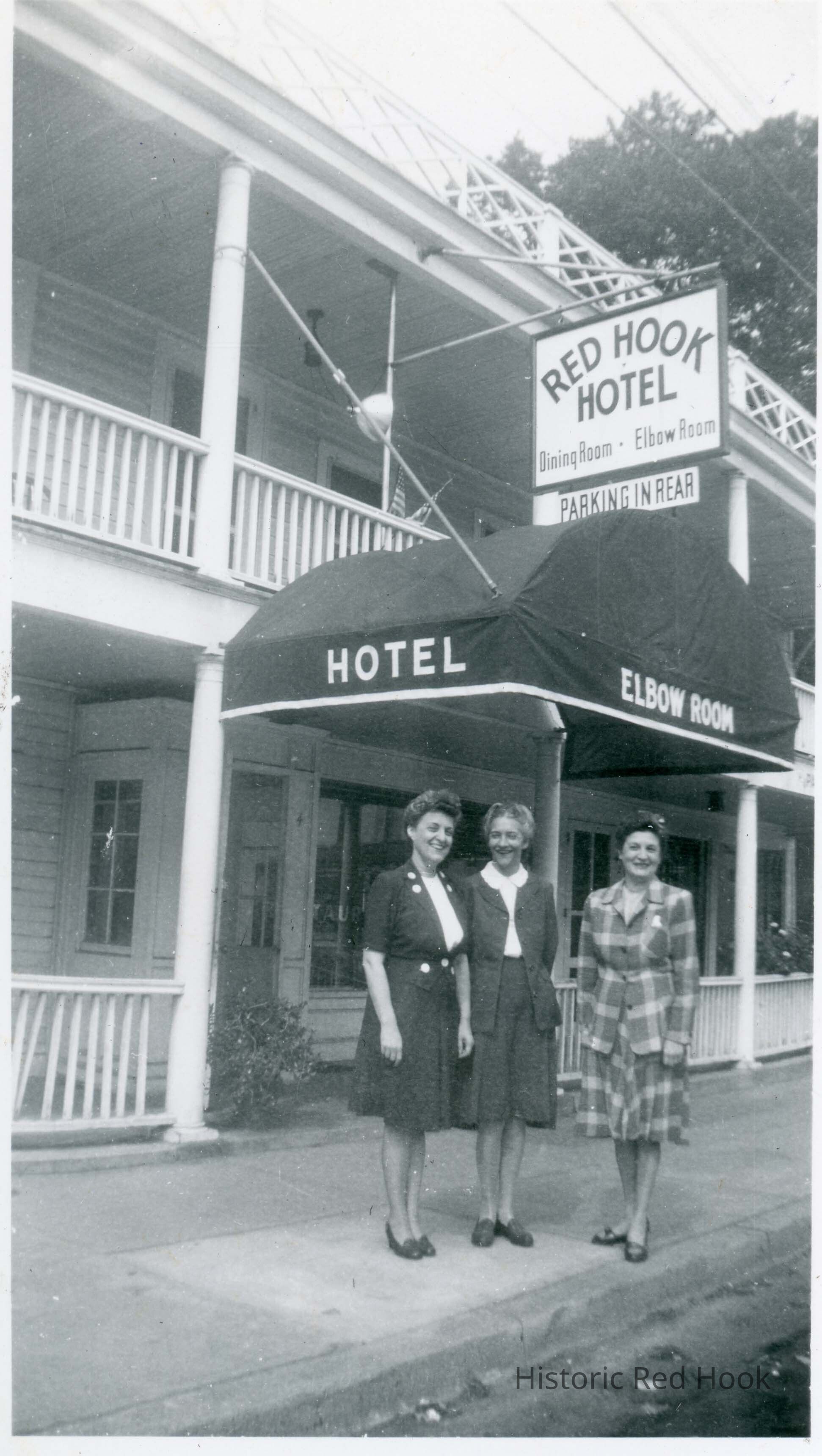 Olive Laib with two women in front of Red Hook Hotel, c 1950Entry/Object ID