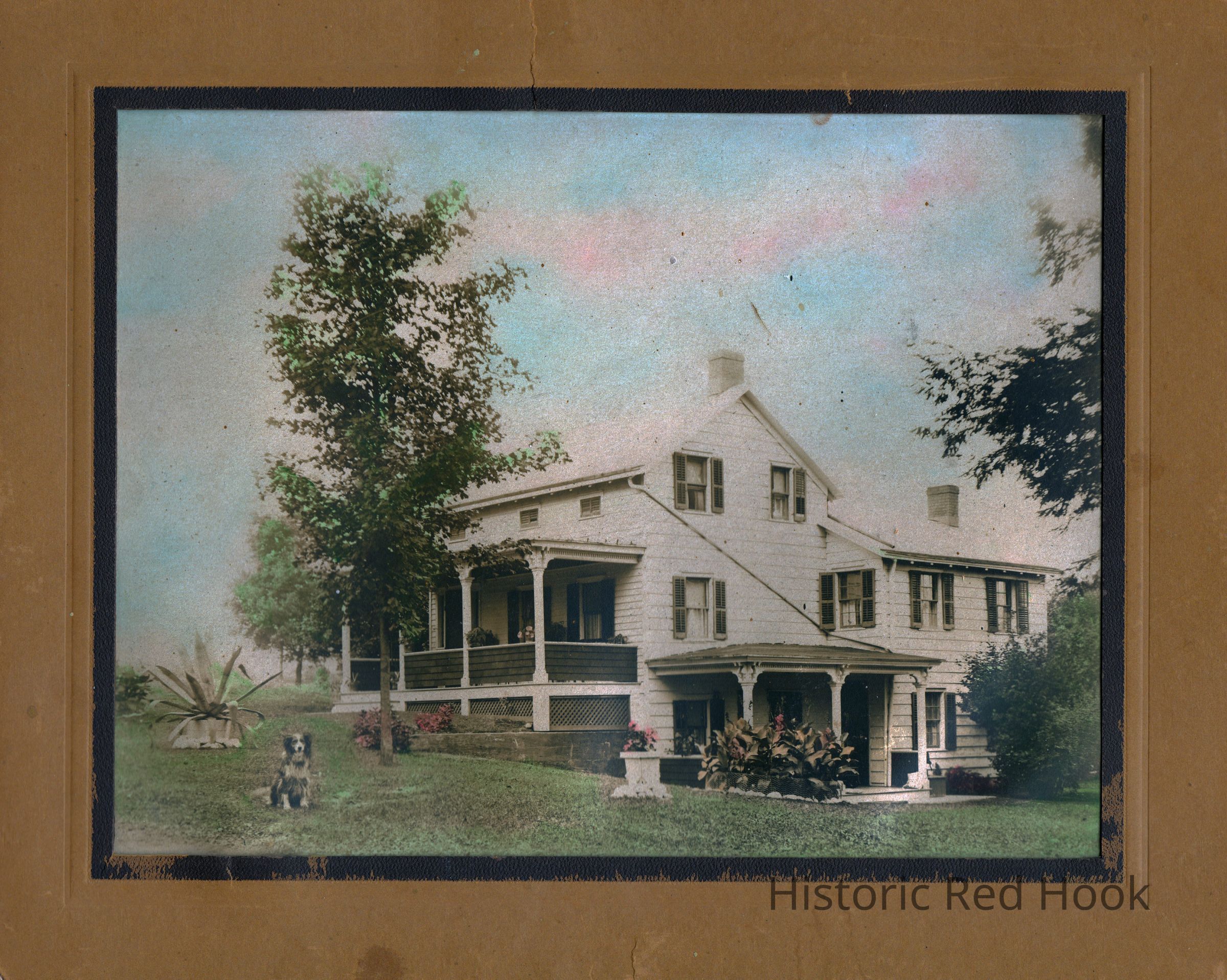 The vintage photo shows a large two-story house surrounded by lush trees and a sitting dog in the foreground