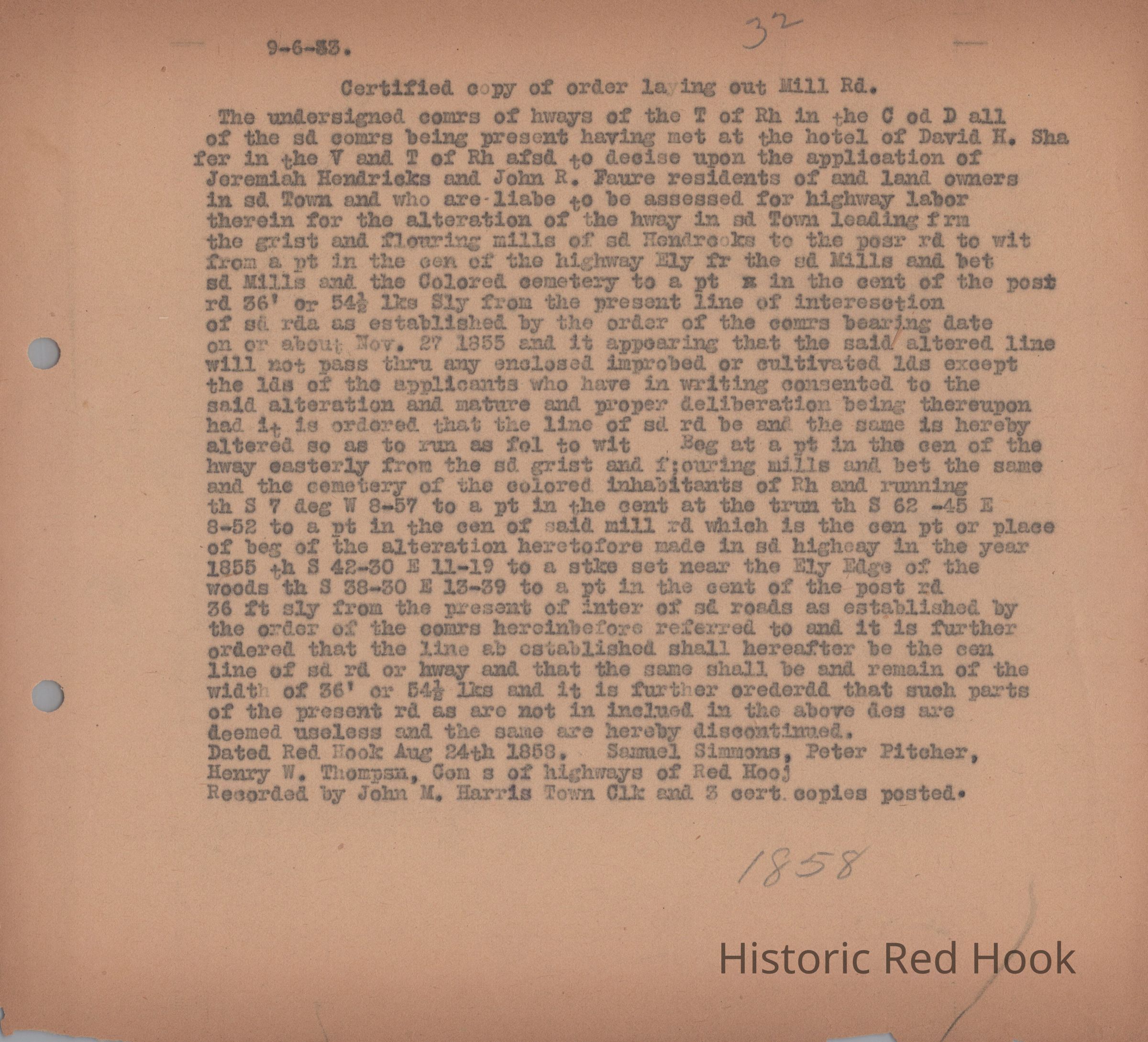 Transcription of Order for laying out Mill Rd, August 24, 1858. Mentions Colored Cemetery. Samuel Simmons, Peter Pitcher, Henry W. Thompson, Coms of Highways of Red Hook.Relationships