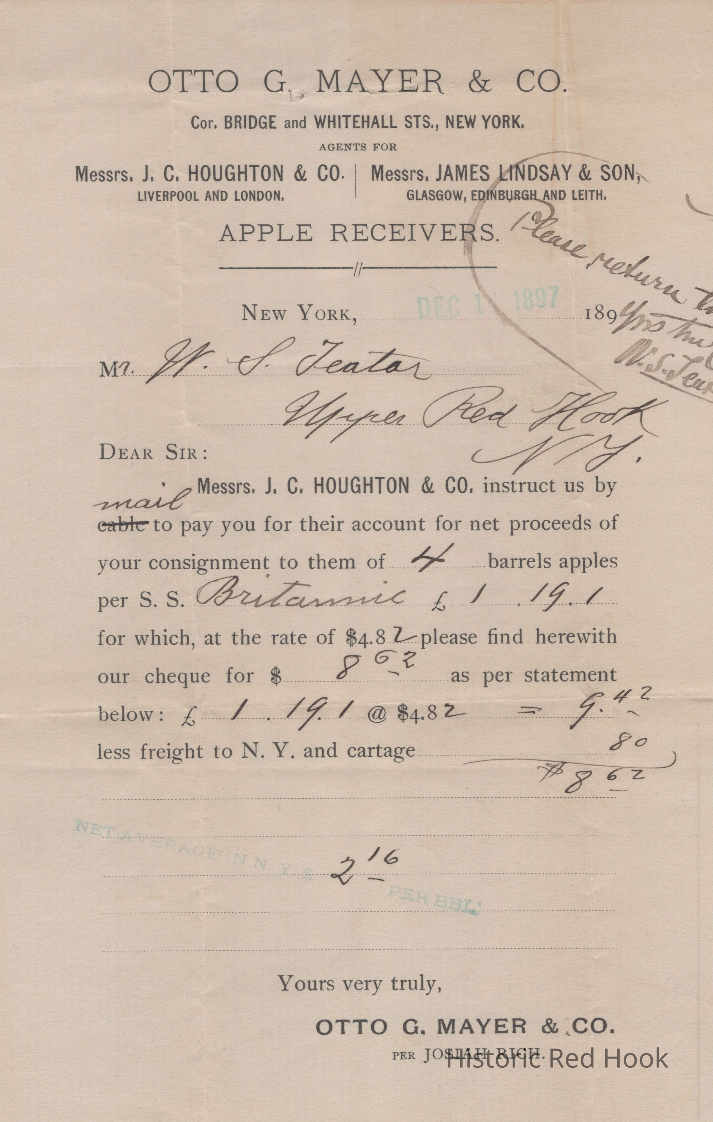 A receipt for W. S. Teator, Upper Red Hook for payment of a consignment in the amount of $8.62 dated December 1, 1897.Relationships