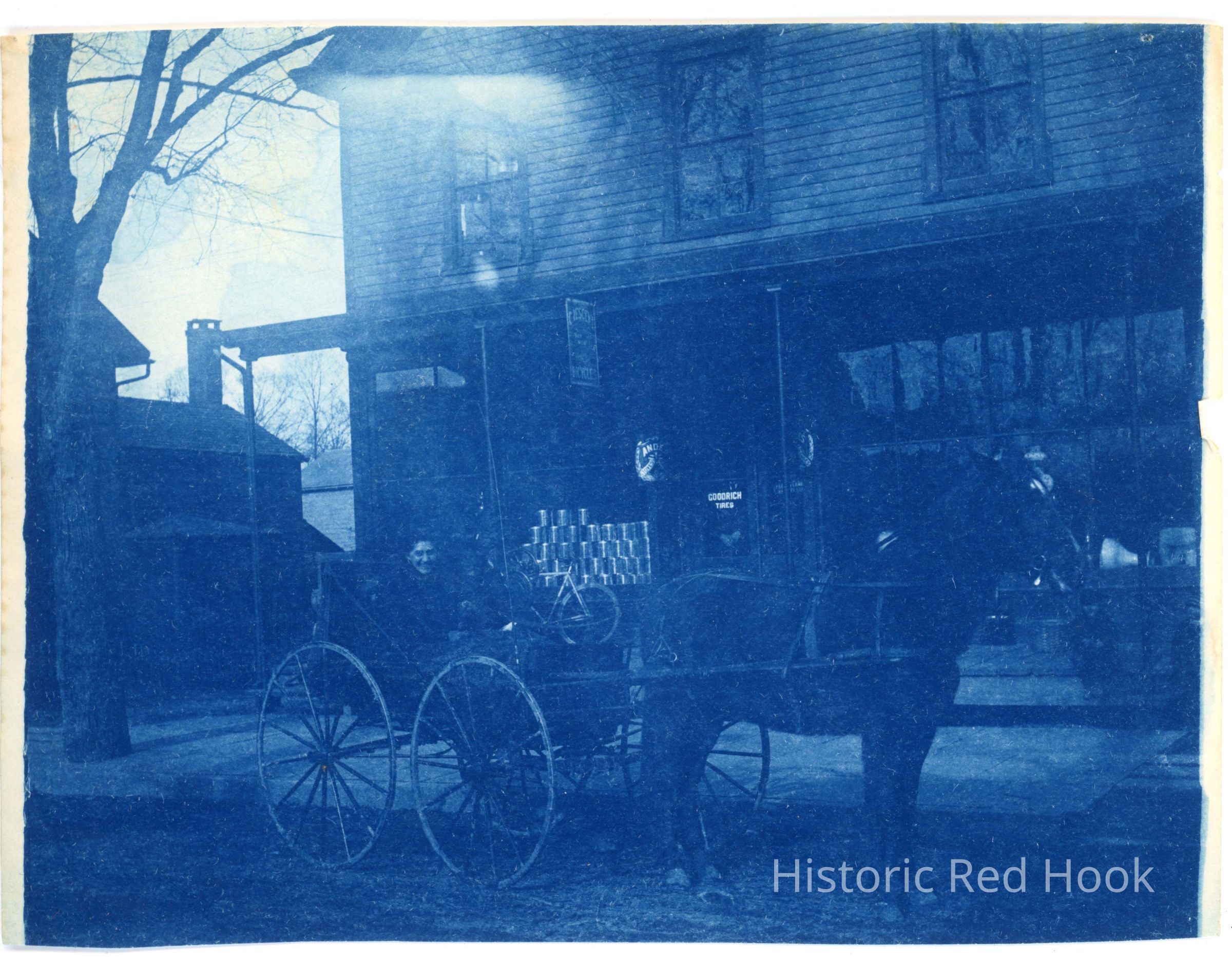 Blue photocopy of P.E. Fraleigh store with Irene Curtis Fraleigh in horse drawn buggy in front.