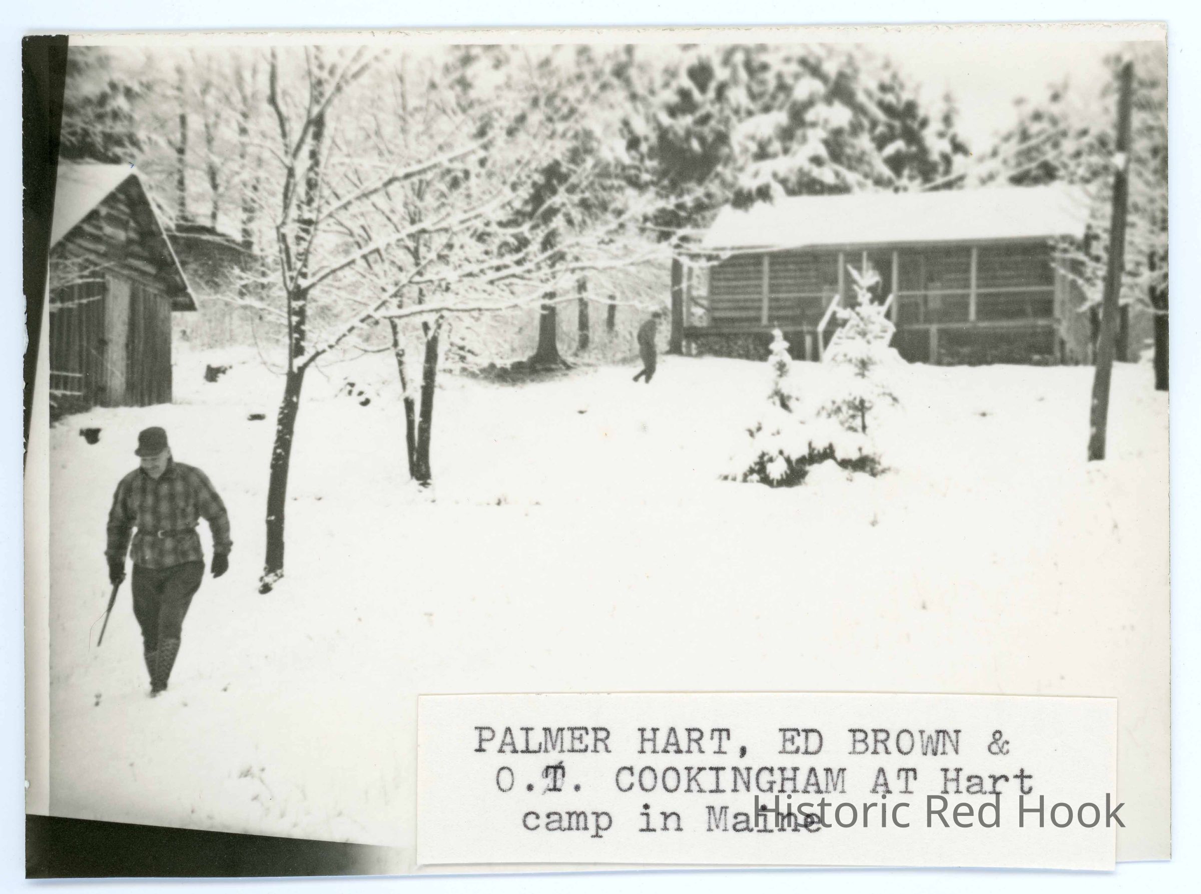 Outdoor winter scene showing snow covered buildings and woods with the men identified as Palmer Hart, Ed Brown & O.T. Cookinghm at Hart Camp in Maine.Photograph Details