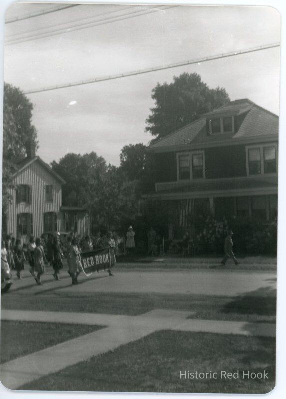 Photo, taken Jan 1981, of original photo of parade for Red Hook school centralization, May 1937.