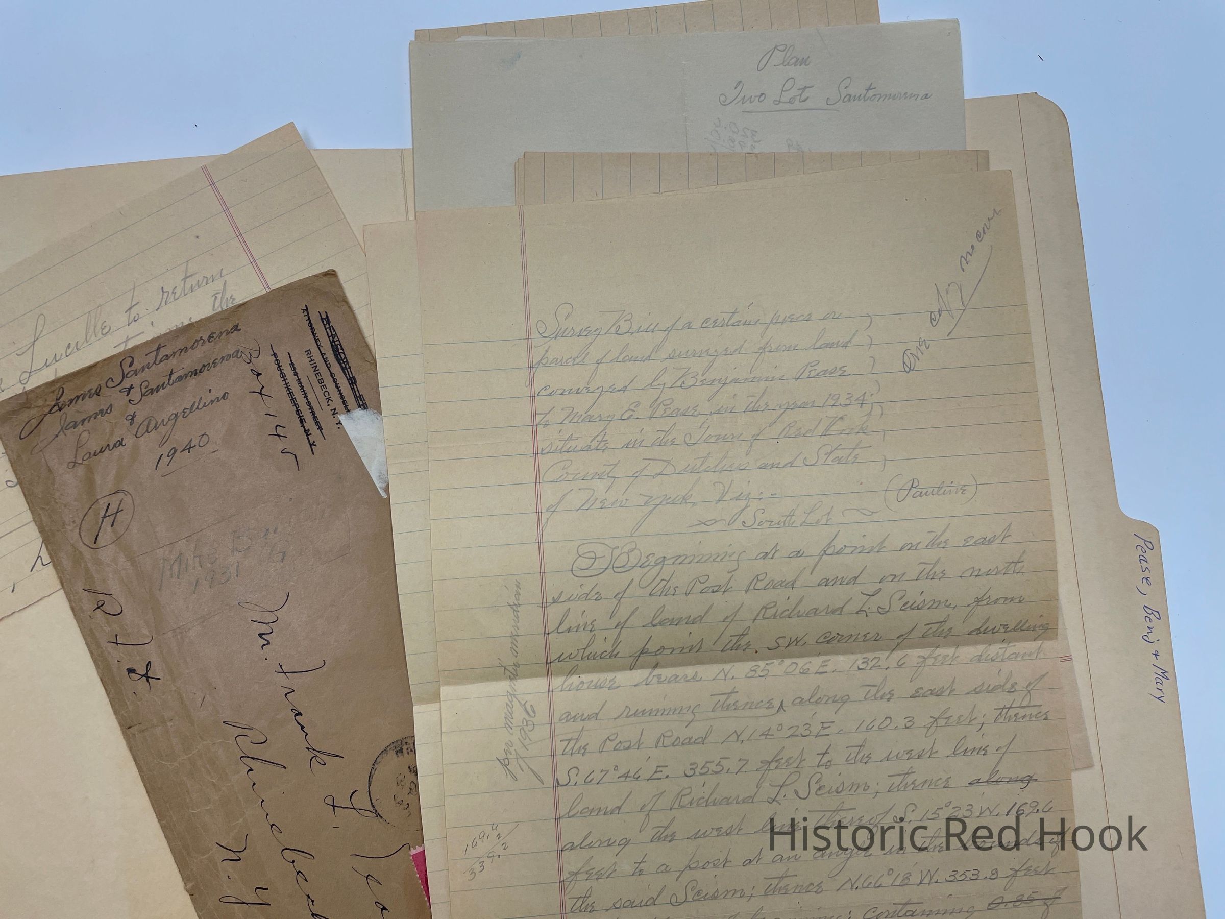 Survey: For James Santamorena 7 Sep 1940. Parcel from land conveyed by Benjamin Pease to Mary E. Pease in 1934 [ South Lot] 9Pauline)1.35 acres. [North Lot] (Catharine) 1.35