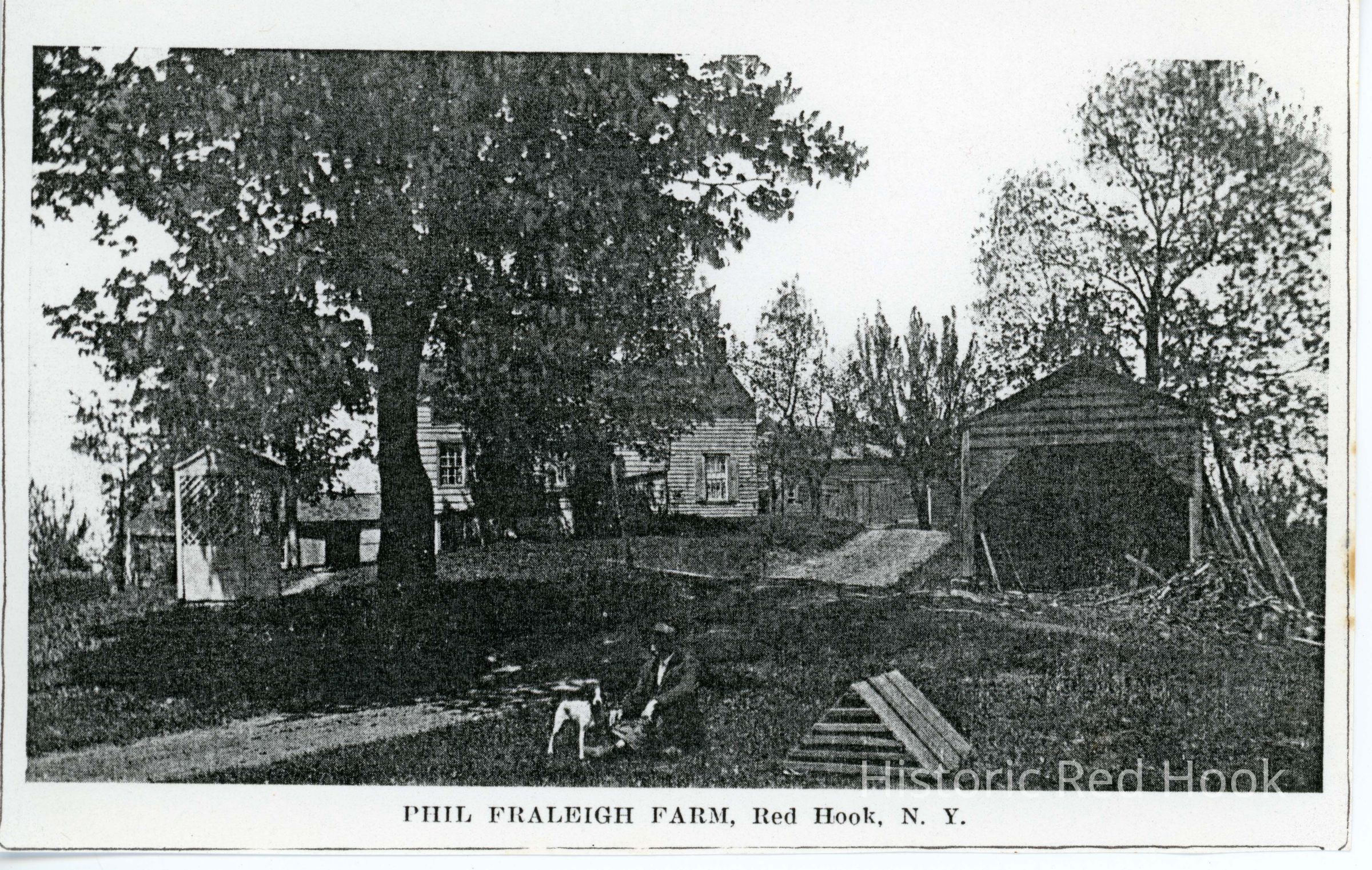 photocopy of postcard of Philip Fraleigh Farm, Red Hook N.Y. circa 1895, includes outbuildings and man and dog in foreground