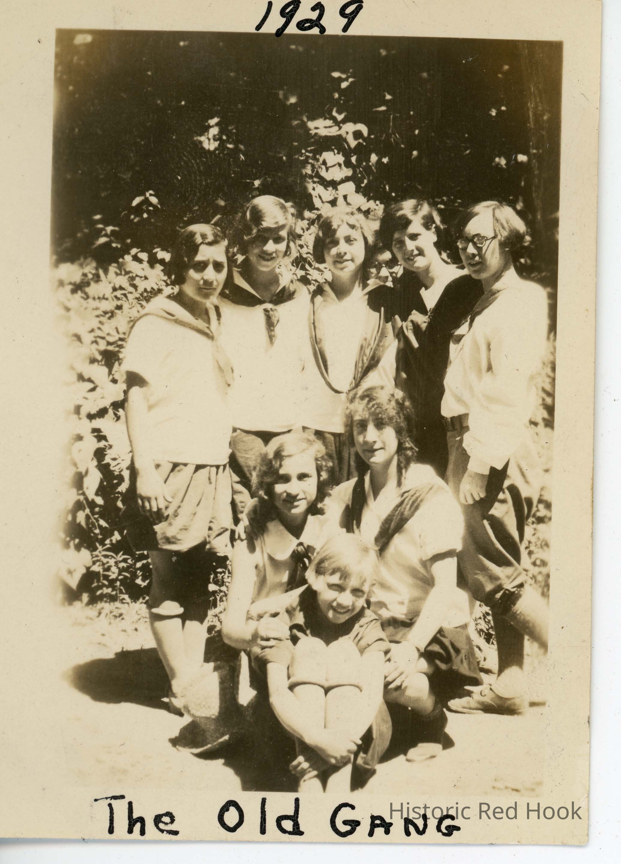 Eight campers posing. 'The Old Gang 1929' written on border.