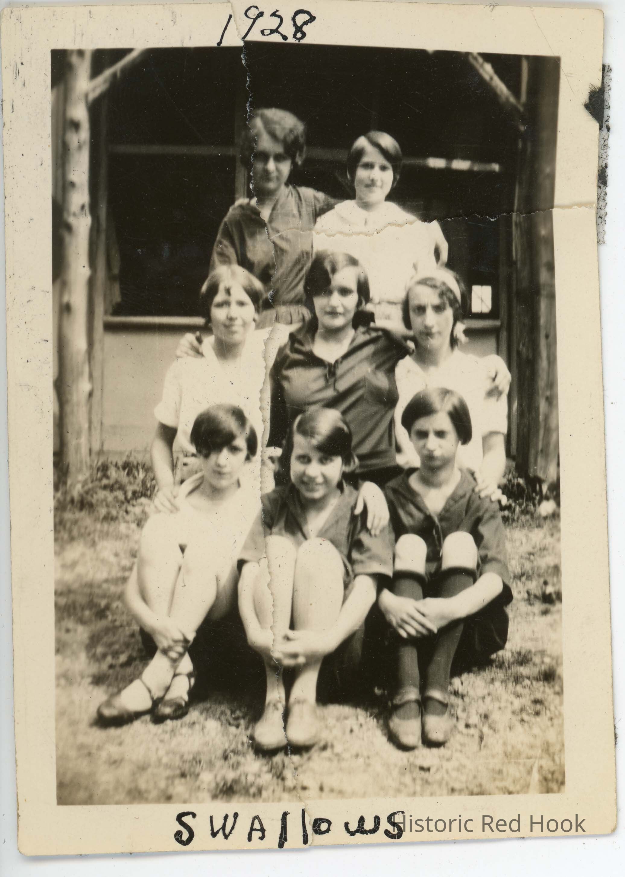 Eight campers posing. 'Swallows, 1928' written on border.