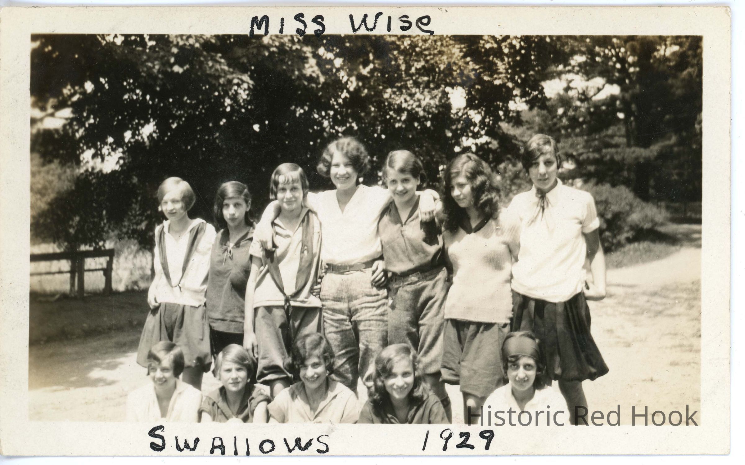 Six campers and woman posing. 'Miss Wise Swallows 1929' written on border.