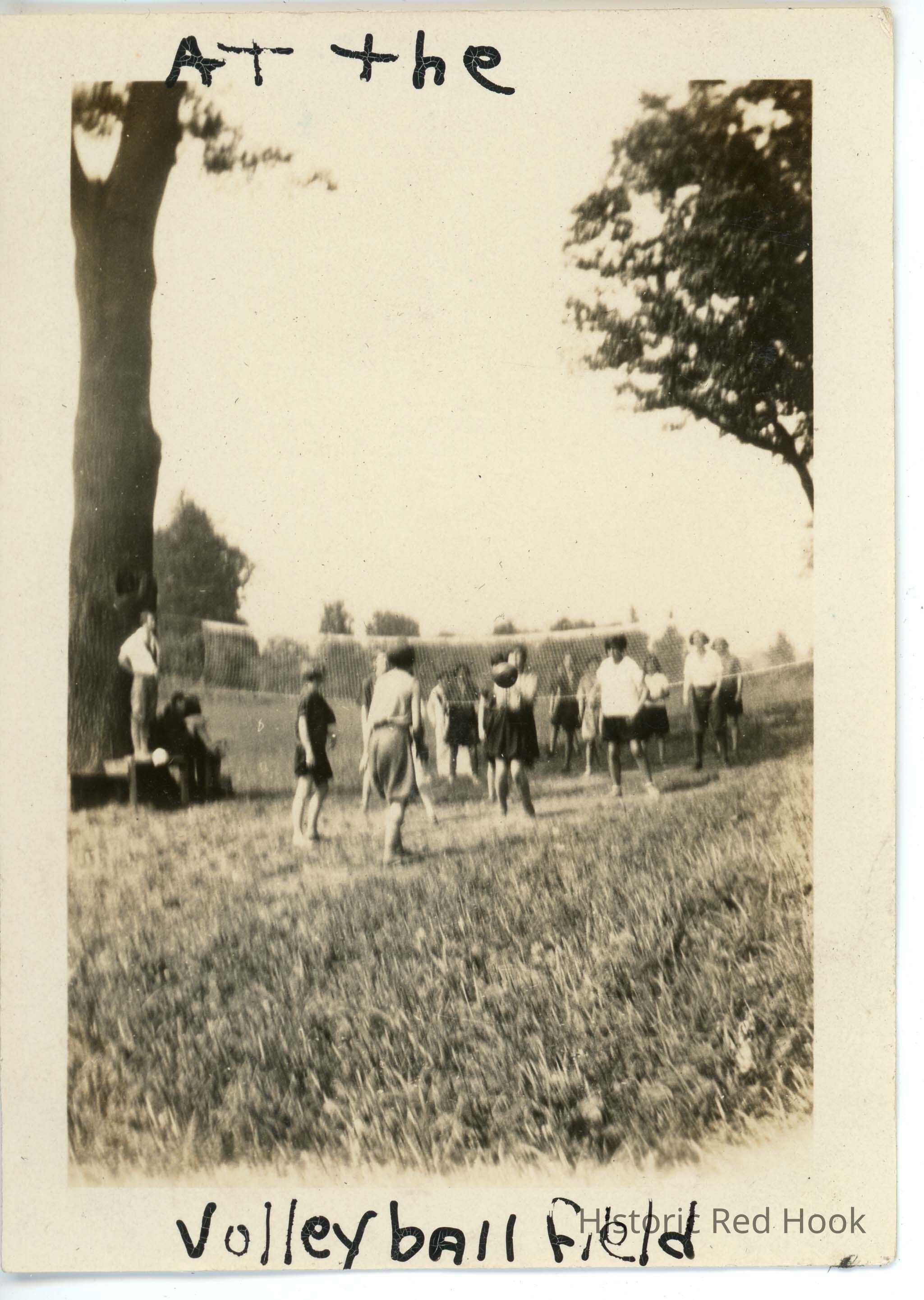 Group of girls at volleyball net. 'At the Volleyball field' written on border.